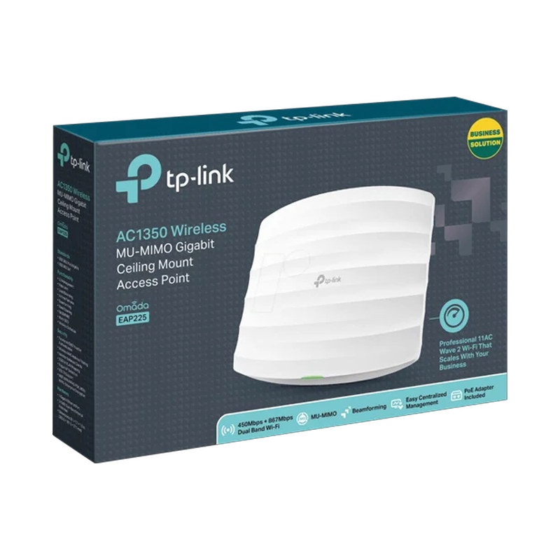 Introducing the TP-Link EAP225, an advanced AC1350 Wireless Dual-Band Gigabit Ceiling Mount Access Point designed to deliver high-speed, reliable Wi-Fi connectivity for both home and office environments. This access point supports the latest 802.11ac Wave 2 Wi-Fi standard, providing combined wireless speeds of up to 1200 Mbps—300 Mbps on the 2.4 GHz band and 867 Mbps on the 5 GHz band.