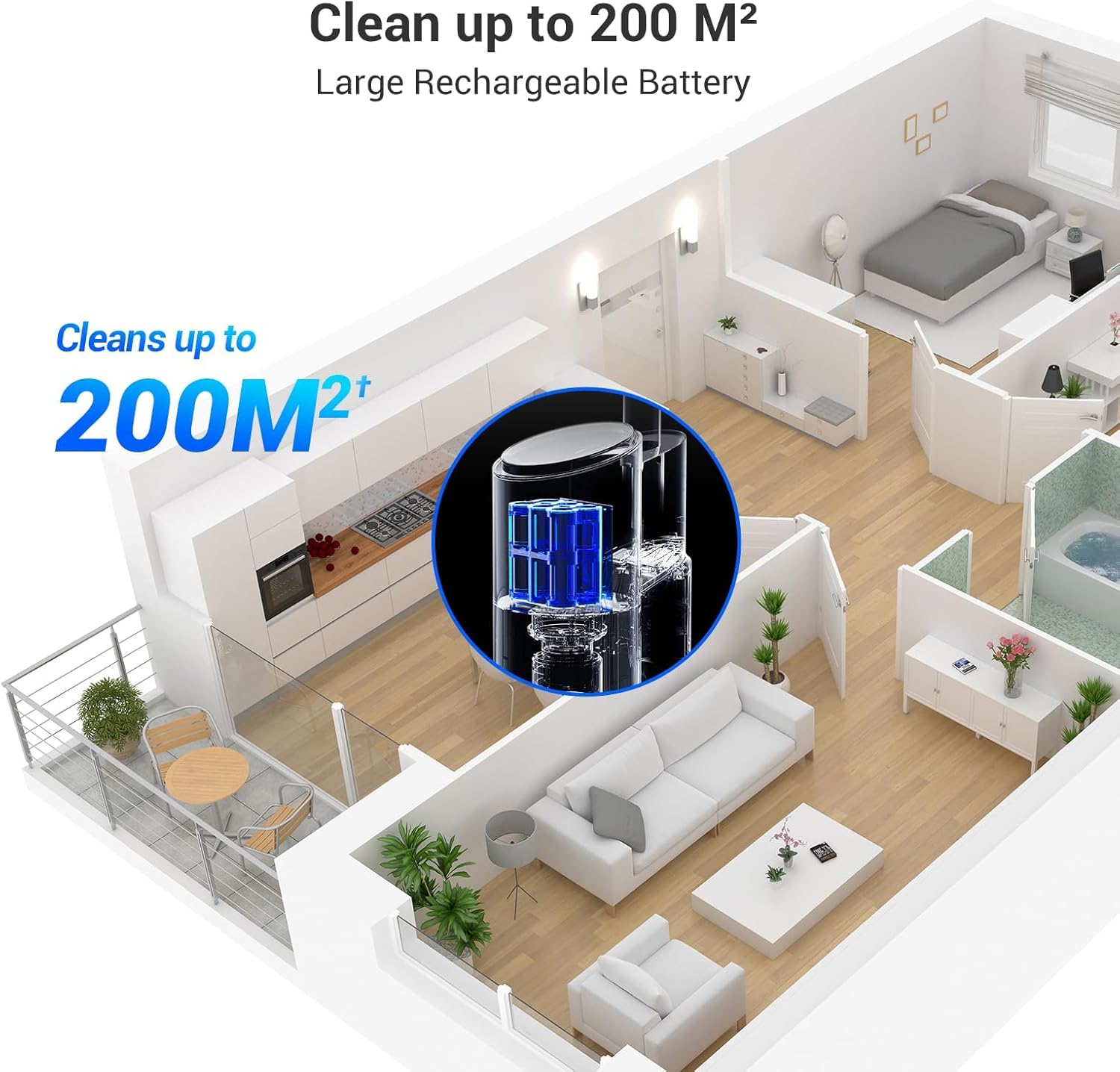 - LED Screen & Clean up to 200 M² & Safe for Pets: Thanks to the large water tanks and the large-capacity battery, you can easily trust the RH2 to go all the way across the living room and to every bedroom. Stay informed about the power level, ongoing tasks, and maintenance alerts, with the help of the large LED screen and auto-play voice prompts. Besides, it features multiple noise-cancelling technologies to keep the sound-level low. Therefore, it will not annoy your family or pets.