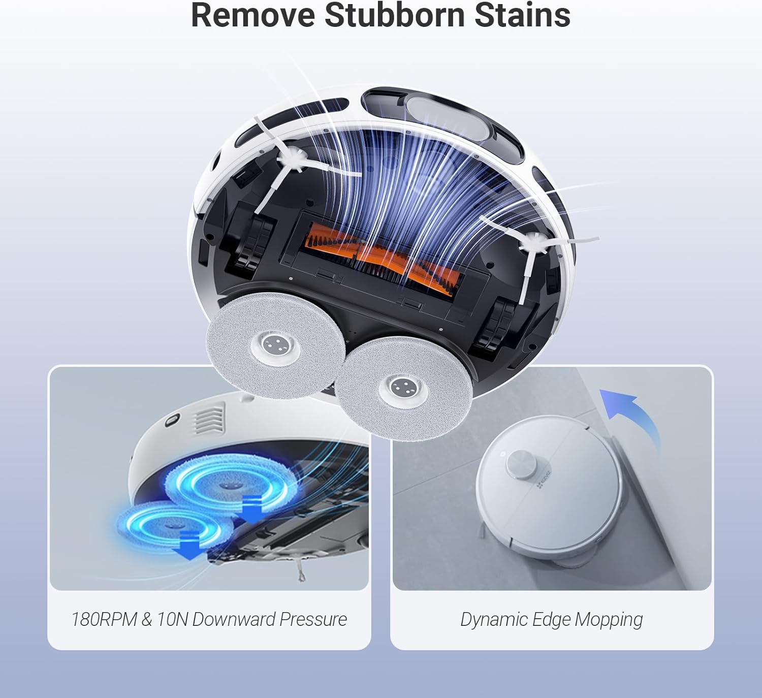 - [Powerful 7,200 Pa Suction & 1KG Downward Pressure] Robotic vacuum RS20 Pro effortlessly removes hidden debris in carpets, including pet hair, for clean floors in just one pass. It uses 1kg of downward pressure to scrub the floor vigorously to remove stubburn stains, just like you would do.
