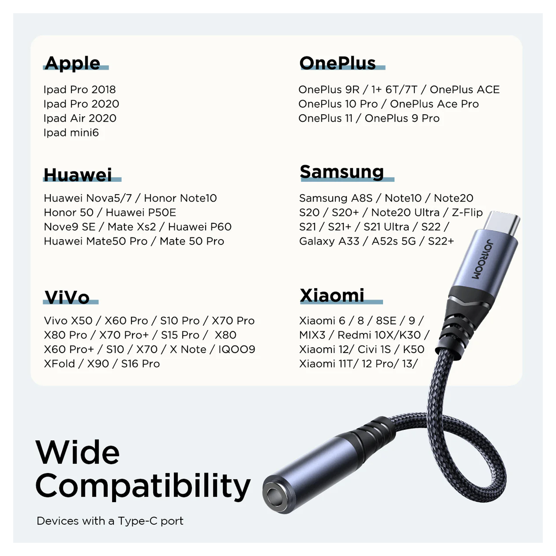 The Joyroom Audio-Transfer Series Audio Adapter provides a seamless solution for connecting your wired headphones to any Type-C device. Offering crystal clear audio transmission and a robust design,