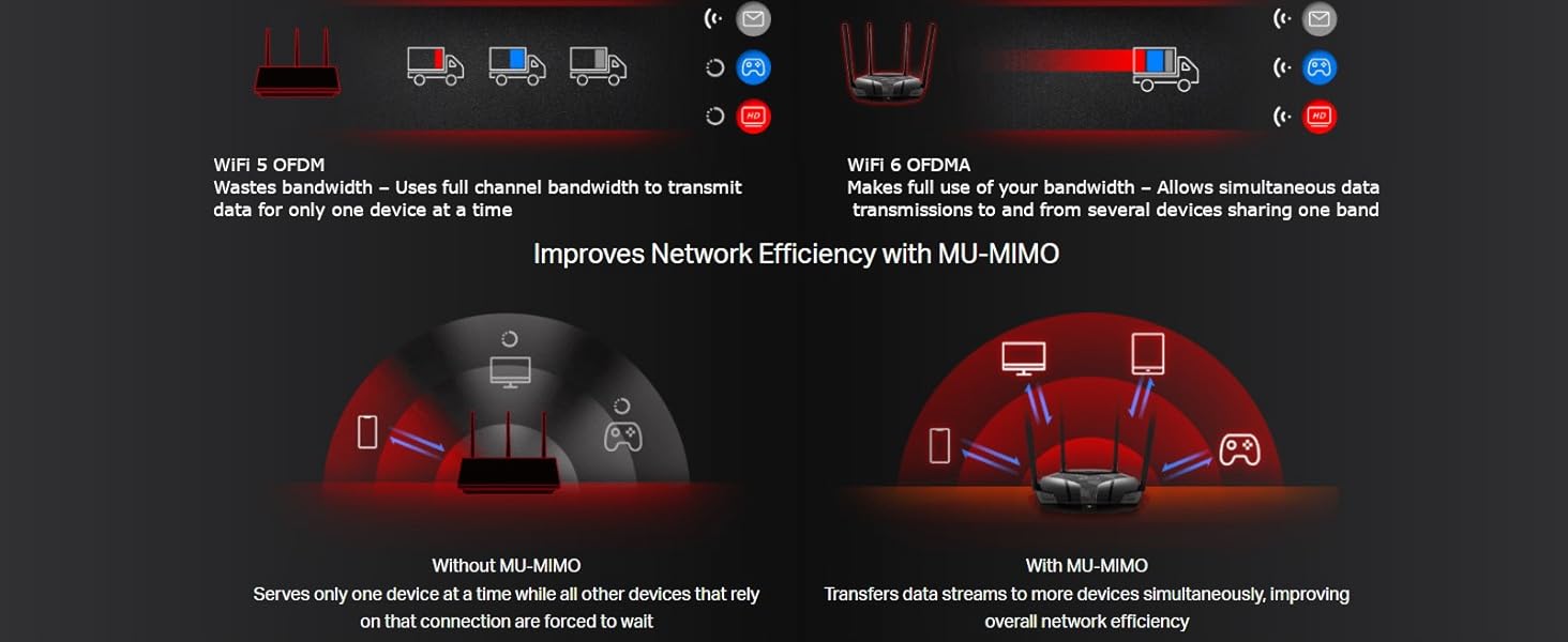 - 4× More Capacity – OFDMA and MU-MIMO allow simultaneous data transmission to and from several devices, improving overall network efficiency