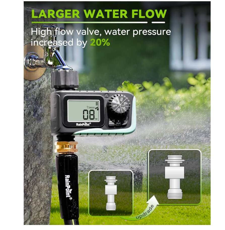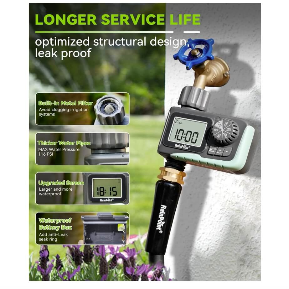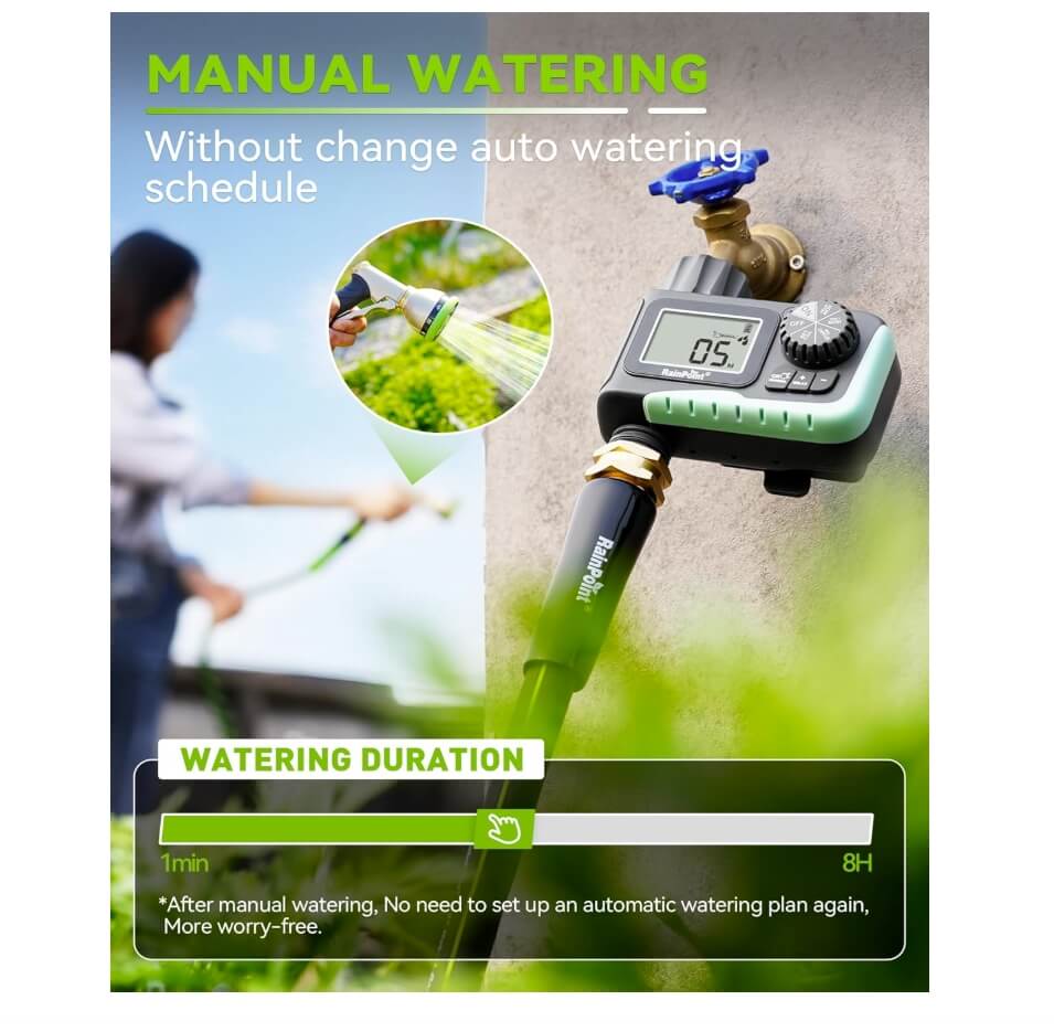 With manual mode, you can water your flowers and plants whenever you want, without Interrupt your schedule.(Watering duration is customizable from 1 minute to 8 hours).