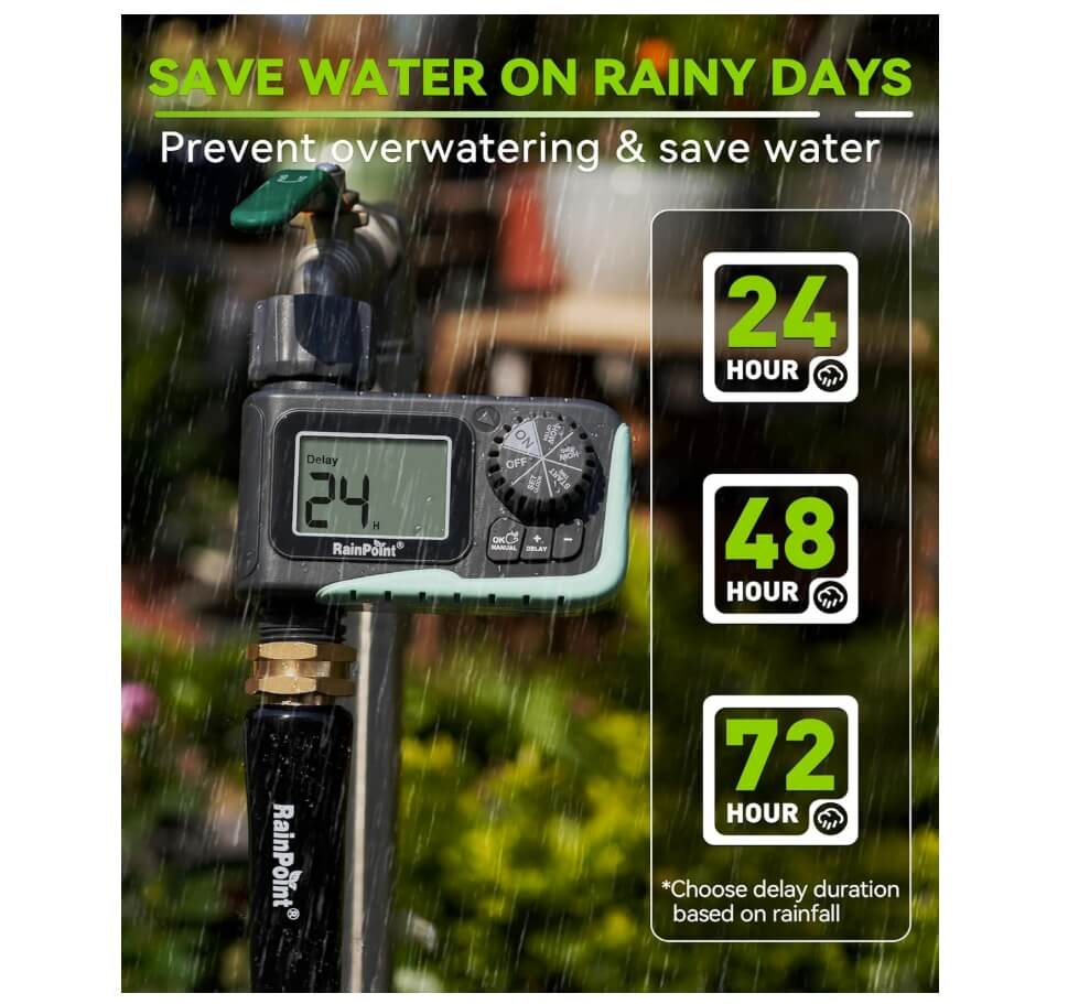 If in rainy, you can activate Rain Delay mode to pause your schedule for 24, 48 or 72 hours to avoid over-watering and water waste. And the countdown will be shown on the screen.