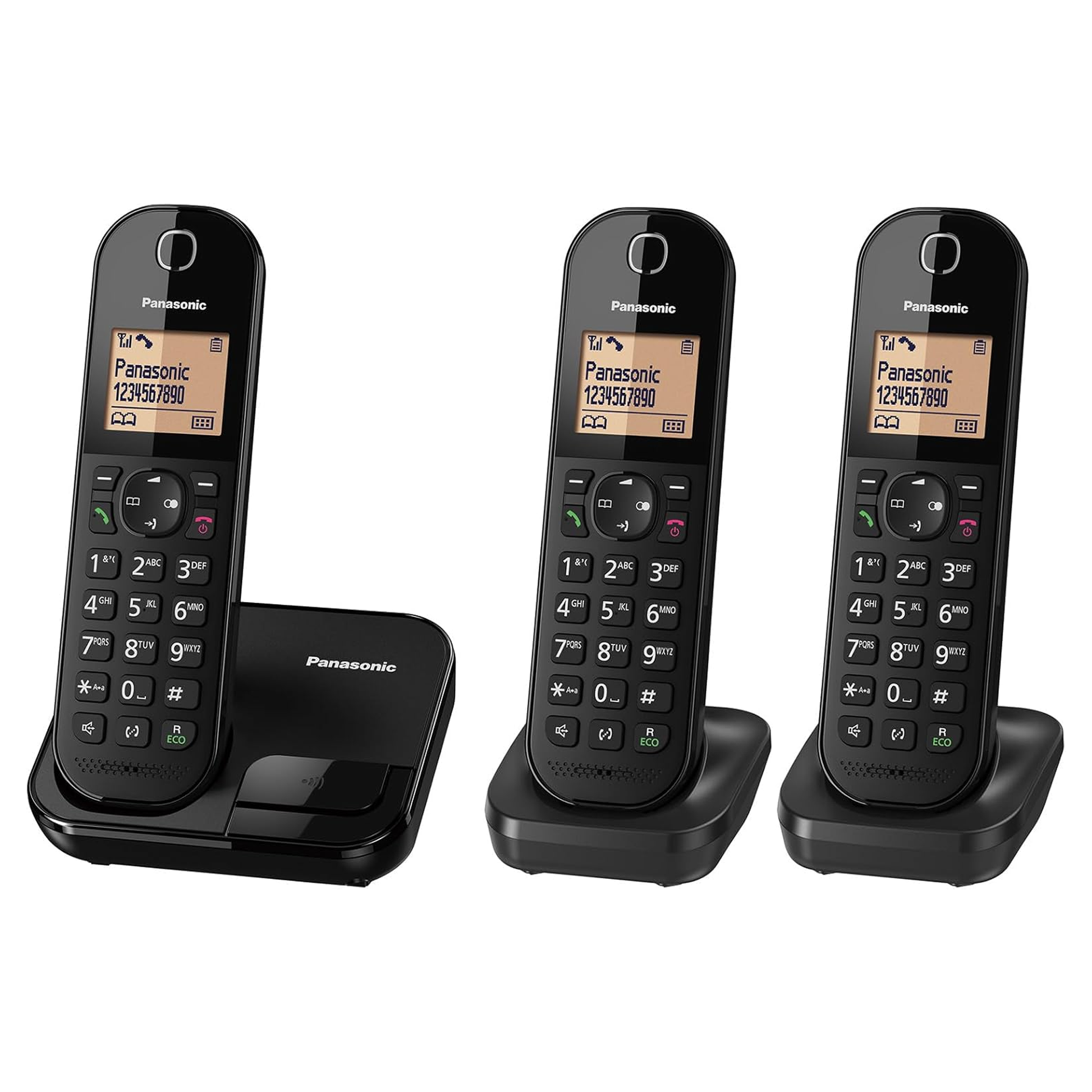 Colour Black Nett Product Weight 0.844 kg Product Dimensions (mm) Height Cordless Handset 165 mm Width Cordless Handset 48 mm Depth Cordless Handset 32 mm Product Dimensions (mm) Height Main Base Unit 63 mm Width Main Base Unit 106 mm Depth Main Base Unit 87 mm Product Dimensions (mm) Height Additional Base Unit 42 mm Width Additional Base Unit 71 mm Depth Additional Base Unit 70 mm Material of Product Plastic Product Warranty 1 Year What's included in the box Main base unit, Handset x 3, Additional base unit x 2, Batteries, Telephone line cord, AC power supply x 3 Shared Phonebook Up to 50 entries 18 Hours Talk Time 200 Hours Standby Time LCD Display HandsfreeSpeakerphone Speed Dial 9 entries Redial Memory Up to 10 phone numbers Key Lock on Hands.