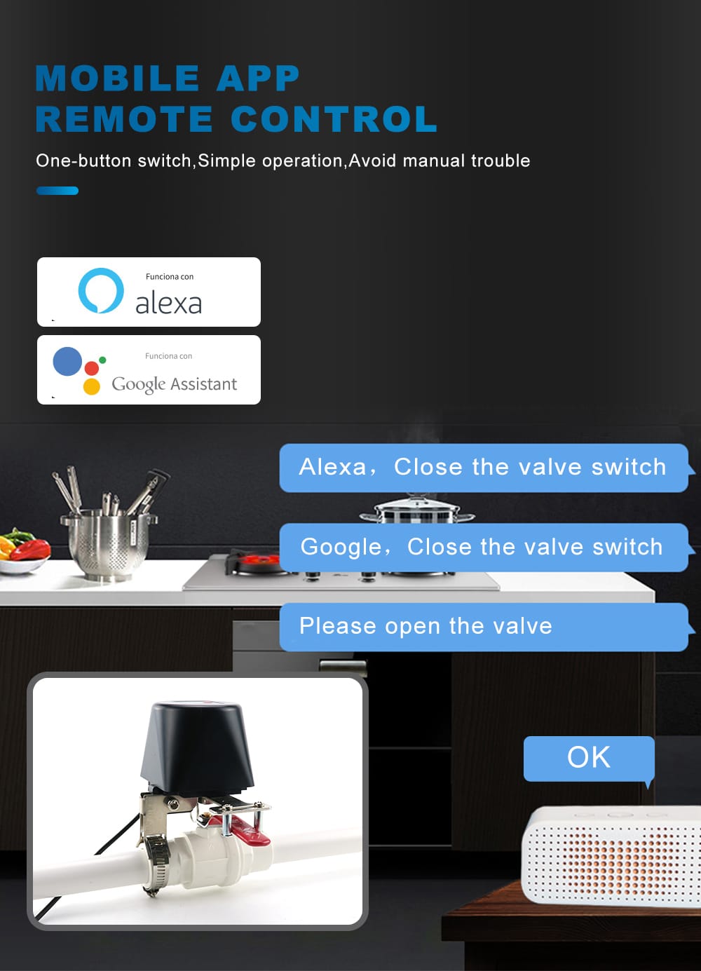 mart Wi-Fi valves are compatible with Amazon Alexa and for Home assistant, and it can allow you to turn off and turn on the water valve by voice