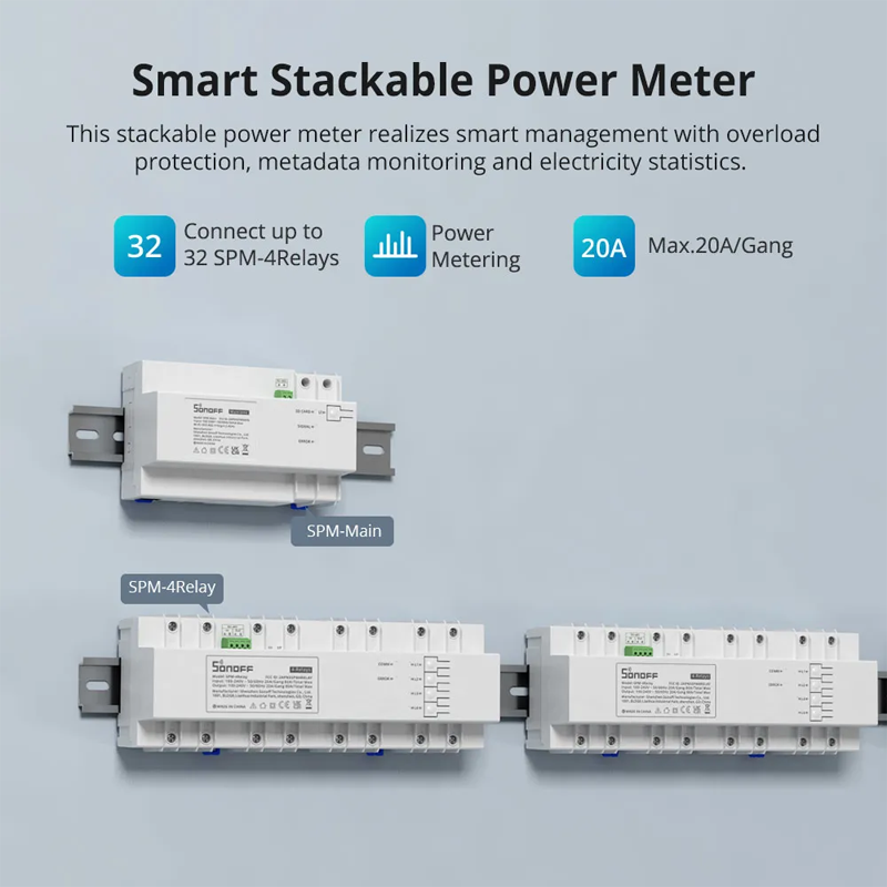 The Sonoff SPM-Main is the central controller in Sonoff's Smart Stackable Power Meter (SPM) system, designed for advanced energy monitoring and management across multiple circuits. It's particularly suitable for environments like office buildings, shopping malls, server rooms, and industrial facilities.