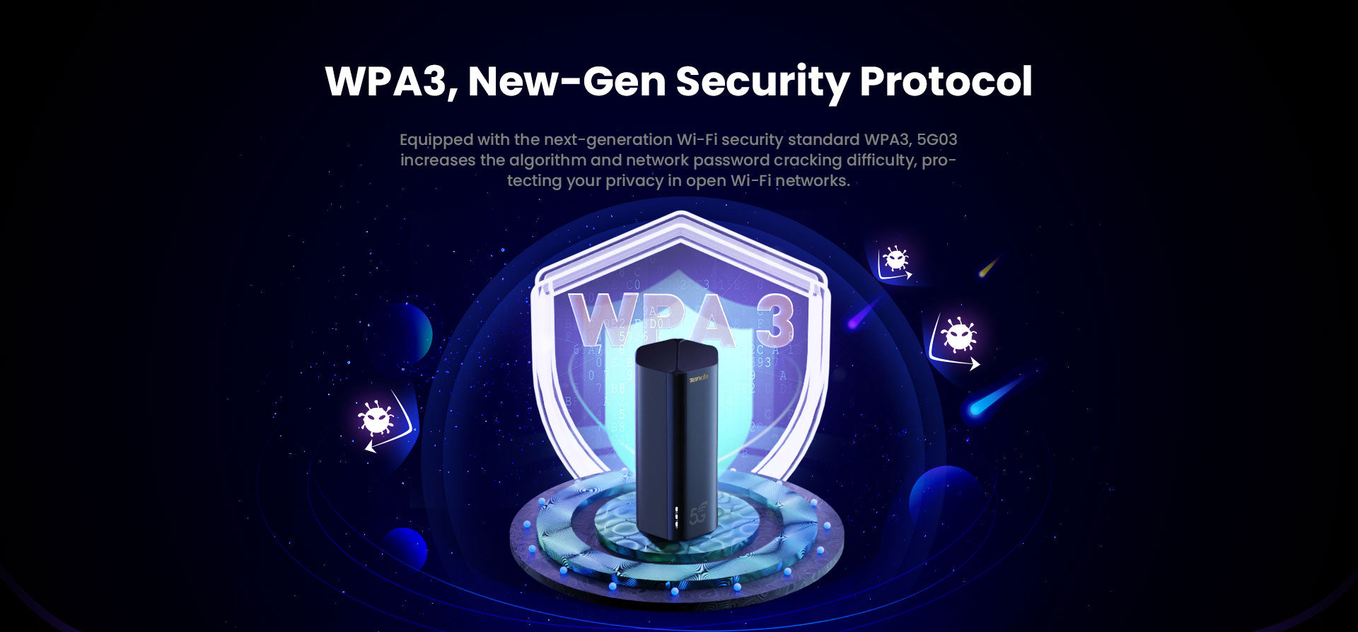 All new 5G network, fast WiFi6 and exceptional smart system. With all the new techs, now, introducing 5G03, the innovative Internet access entrance for you, most advanced geek pioneers, and the most advanced internet experience for you. Also, 5G03's deep black and delicate design of texture and highlight on the surface take our progressive geek philosophy to a new dimension.