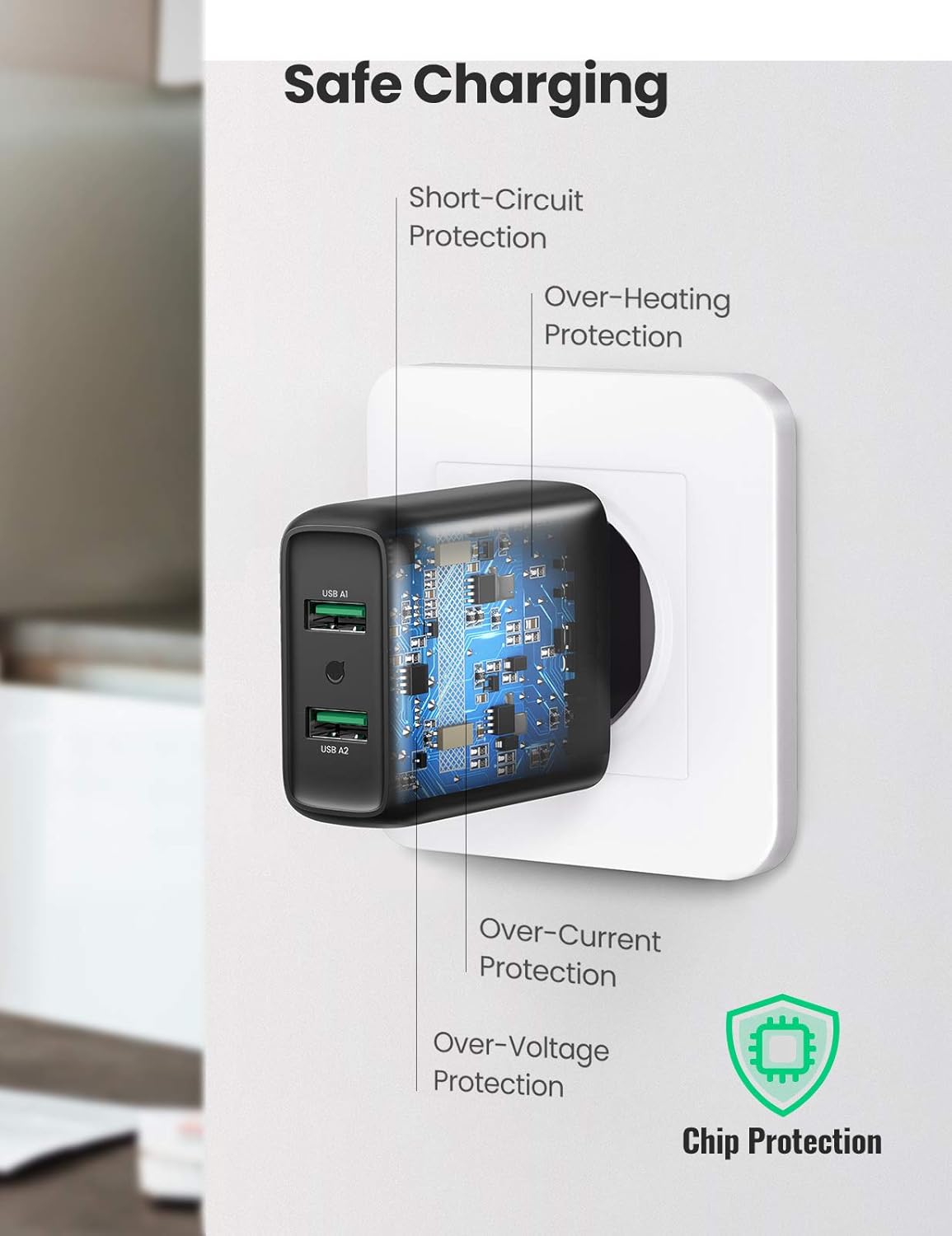 UGREEN 10216 USB Charger 36 W Quick Charge 3.0 2 Port Charger Adapter (Black)/ 10216