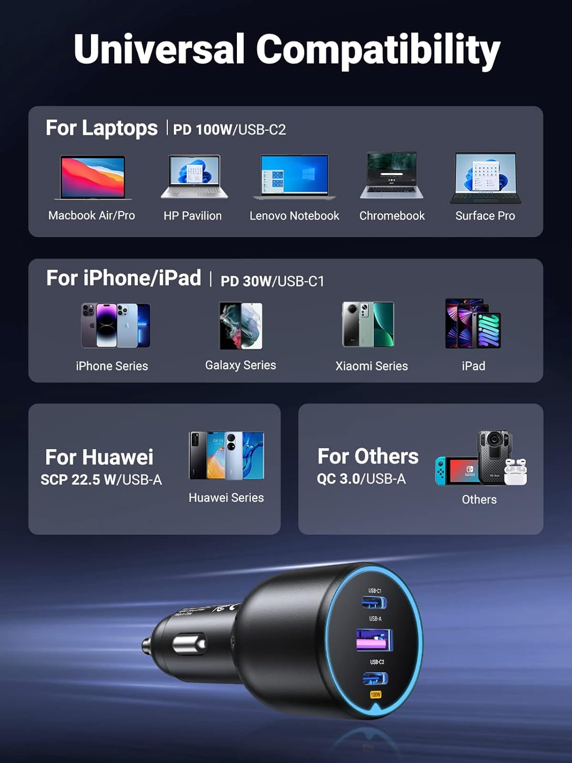 - 【Broad Compatibility】Compatible with iPhone 15/14/13/12/11/SE/X series; Galaxy S24 S23 S22 S21 S20 Ultra/Tab S8; iPad Pro/Air; MacBook, ChromeBook, Drone, Lenovo, Dell, HP, Google Pixelbook, LG, Kindle Fire HD 10, Steam Deck, Switch, Bluetooth receivers, dash cams and more devices. This type c car charger has full flexibility for most of car models with a 12V-24V cigarette socket.