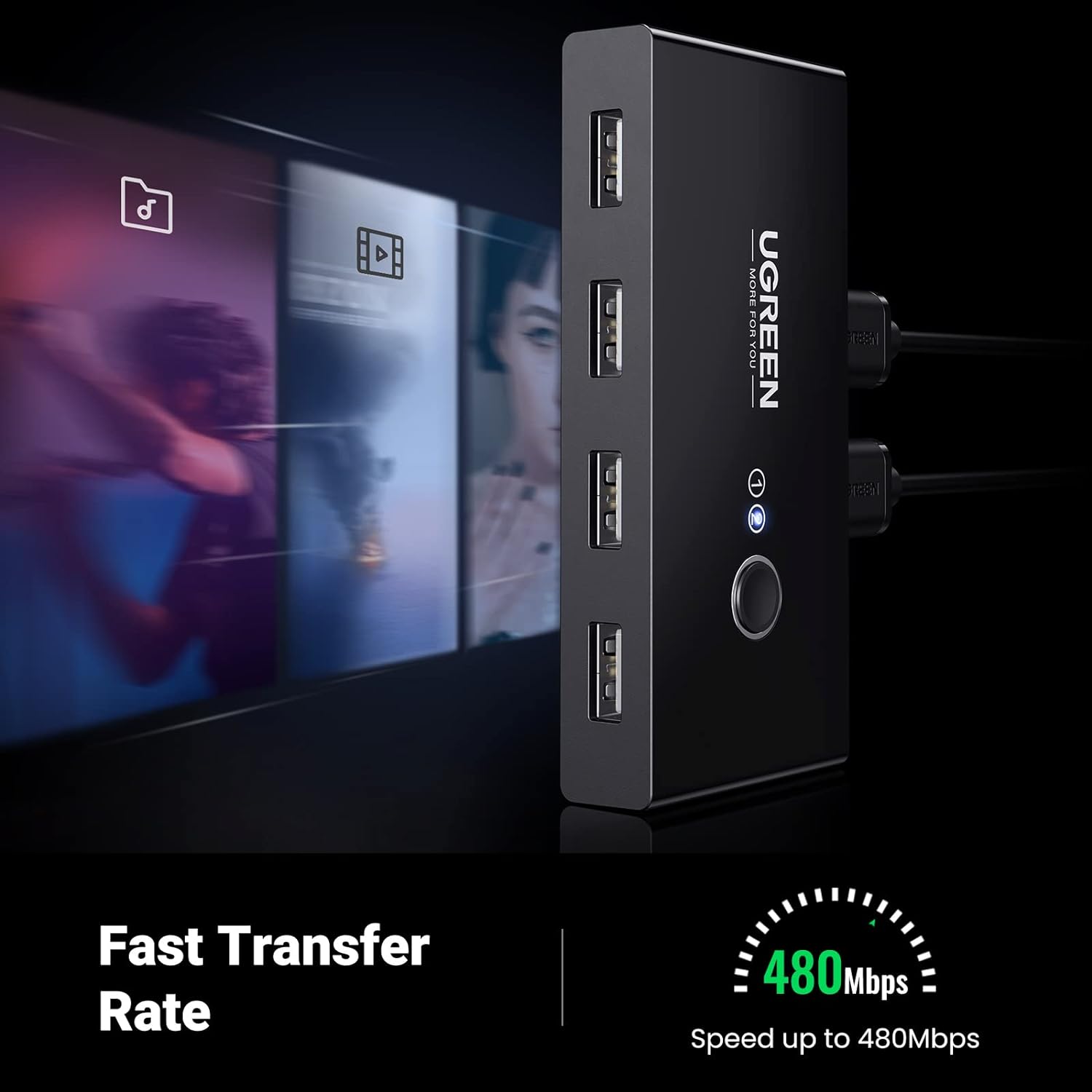 - 2 in 4 Out USB Switch Box: UGREEN 4 port USB sharing switch allows one button swapping between 2 computers to share 4 USB 2.0 peripheral devices without constantly swapping cables or setting up complicated network sharing software.