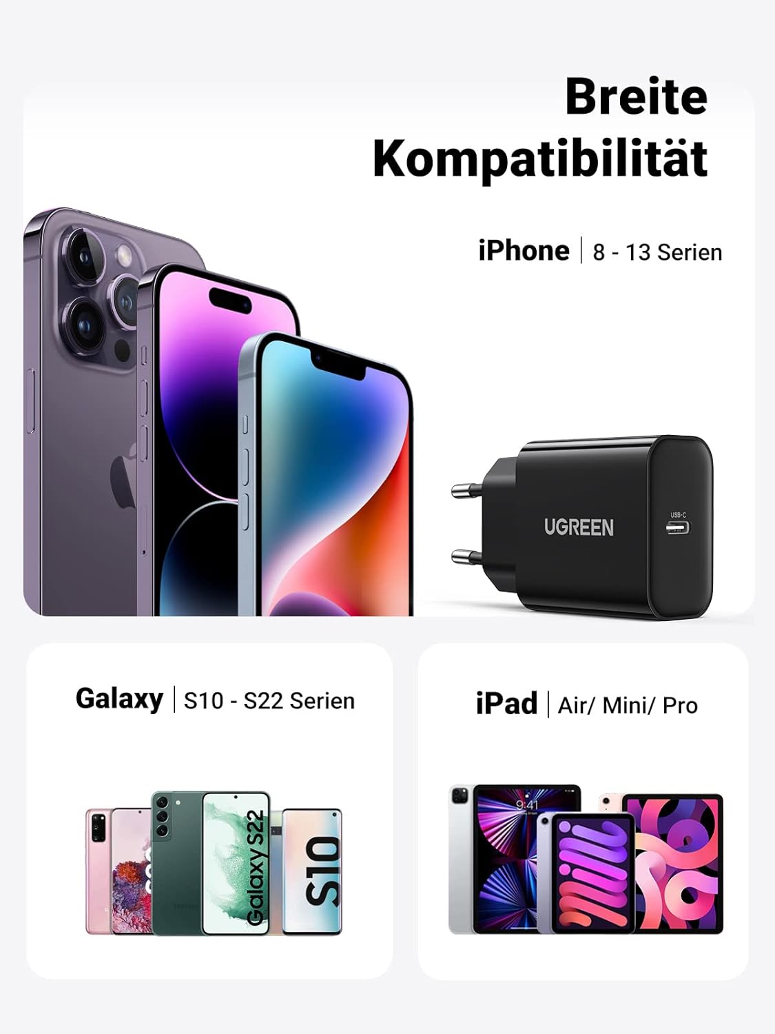 - [Universal Compatibility] 20W charger USB C is compatible with iPhone 14/ 14 Pro/ 14 Pro Max/ SE 2022/ 13/ 13 Pro/ 13 Pro Max/ 13 Mini/ 12/ 12 Pro/ 12 Pro Max/ 12 mini/ SE 2020/ 11/ 11 Pro/ XR/ X/ XS/XS 8/8+, iPad Pro, iPad Air 2022, iPad mini 6/5, and all USB-C enabled devices.