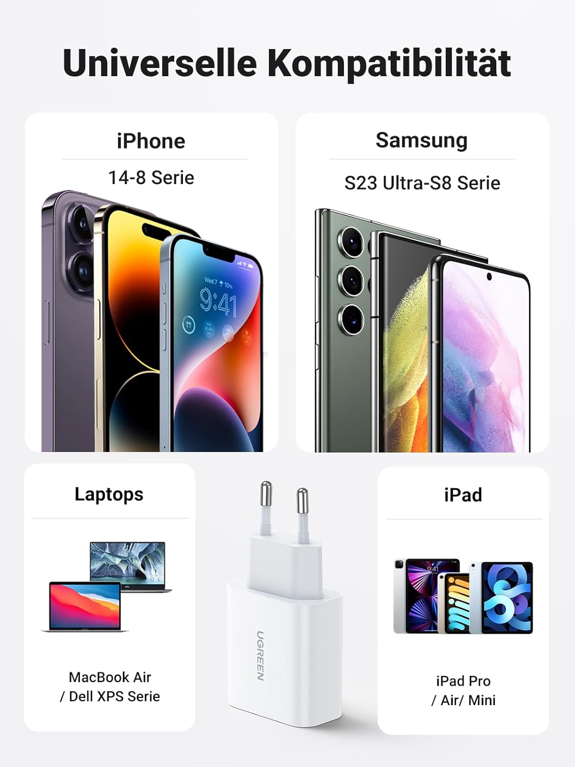 - Universale Kompatibilität: Das USB C Charger ist kompatibel mit iPhone 13, 13 Pro, 13 Pro Max, 12, 12 Mini, 12 Pro, 12 Pro Max, SE 2020, 11, 11 Pro, X, XR, XS Max, 8, 8 Plus; iPad Pro M1 2021/2017/2018, iPad Air 2019, iPad Air 2020, iPad Mini 2019; MacBook 12" 2015/2016/2017, MacBook Air 2018/2019/2020, AirPods Pro; Galaxy S21, S20, S10, S8, A51, Note 10; Xperia Serie, Powerbank mit PD Funktion usw.