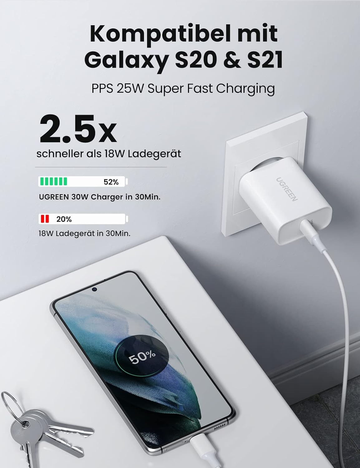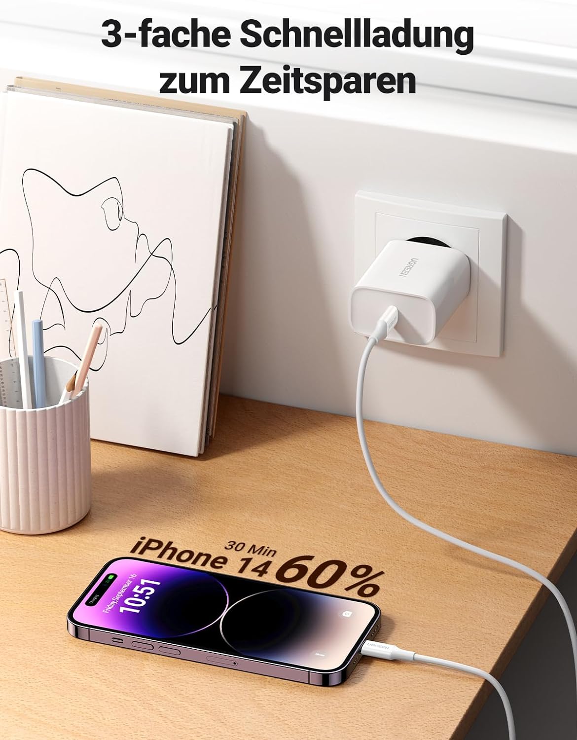 - 30W huge charging power: UGREEN 30W USB C charger can charge your device like iPhone 13 from 0% to 58% in just 30 mins and iPad Pro 2020 to 100% in 1.8 hours. 3X faster than normal charging adapter. Supports 20W USB C output for mobile phones.