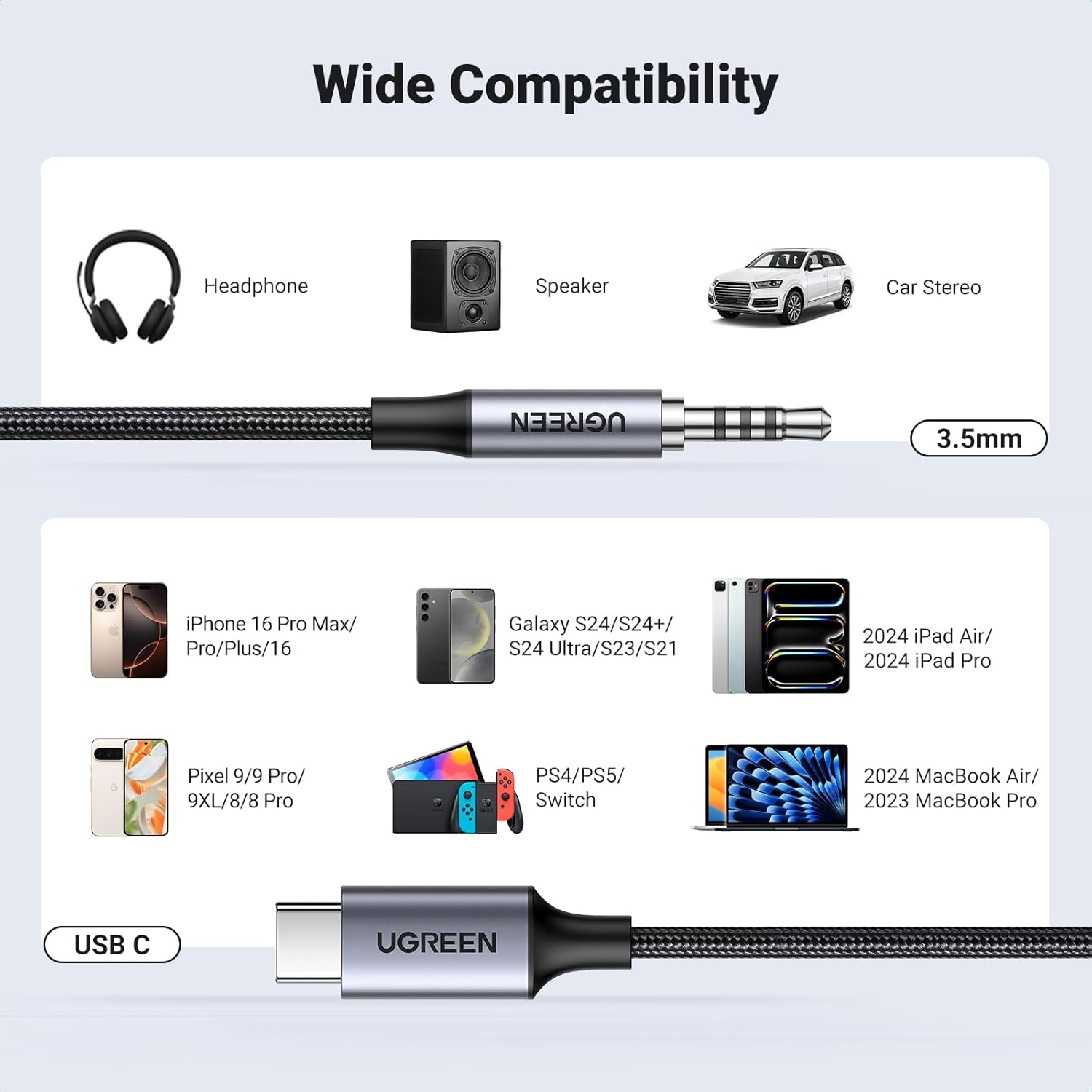 - Wide Compatibility: This 3.5mm to USB C is compatible with iPhone 16 Pro Max/16 Pro/16 Plus/16/15 Pro Max/15 Pro/15 Plus/15, Samsung Galaxy S24/S24 Ultra/S24 Plus/S23 Ultra/S23/S23 Ultra/S23+/S22/S22 Ultra/S22+/Note20/Note20 Ultra/S20 Ultra/S20/Note10+/S10/S10e/S10+/S9/S8, Google Pixel 9/9 Pro/9XL/8/8 Pro/7/7 Pro/6/6 Pro/5a, iPad mini 6/iPad Pro 2021/2020/2018, iPad Air 4, iPad Air 5th 10.9inch, iMac 2021 M1, Macbook Pro 2023, Macbook Air 2022, 10 Pro/9 Pro/8, most of the Type C phones, PS5