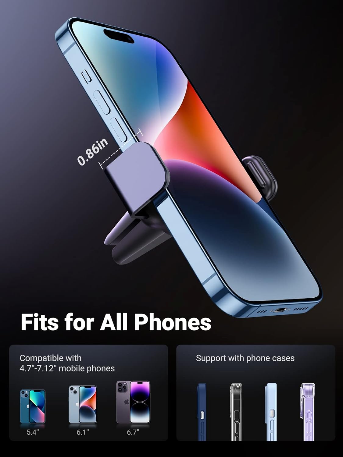 - Broad Compatibility: The vent phone mount for car fits 4.7 to 7.12 inch mobile phones, with width range from 2.4" to 3.6". Please ensure the Max thickness of phone with case is under 0.43". Compatible with new iPhone 15 Pro, iPhone 14 Pro 14 Plus 14 13 12 Mini, iPhone 11 Pro XS Max XS XR 8 7 Plus 6S SE, Samsung Galaxy S22 S21 S10 S9 S8 S7, etc