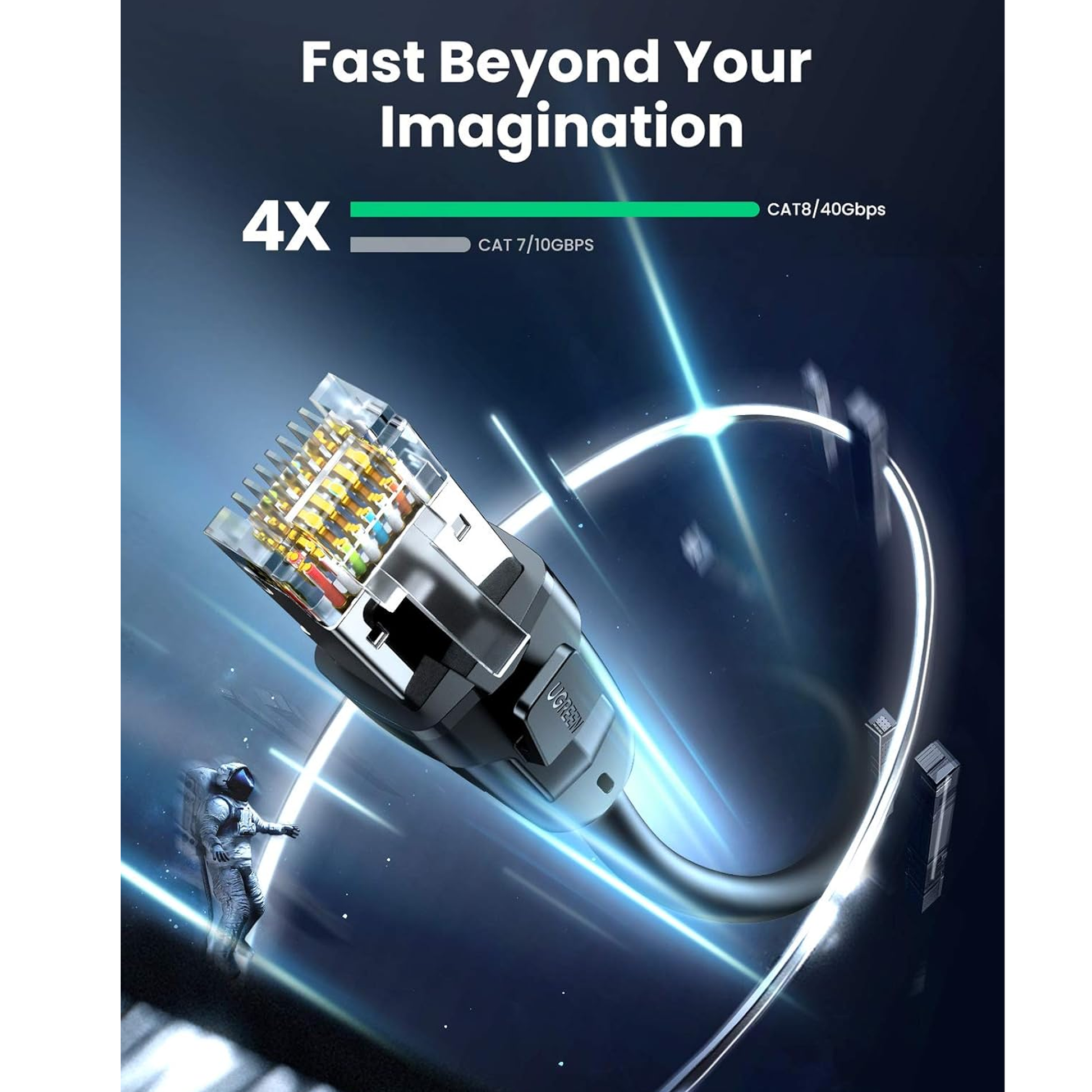 Description for UGREEN CAT 8 RJ45 Pure Copper Patch Cord, Shielded, Bandwidth Up To 25 Gbps, 26AWG Wire Size, Durable and Flexible, 3 Meter Length, Black