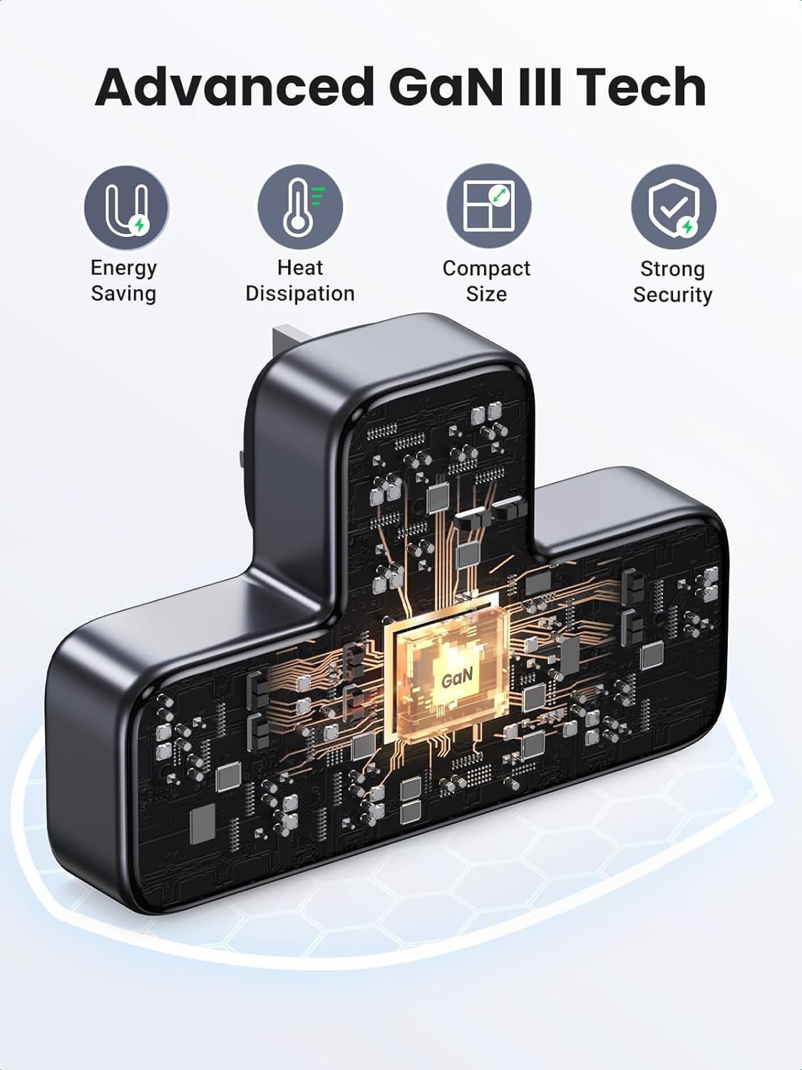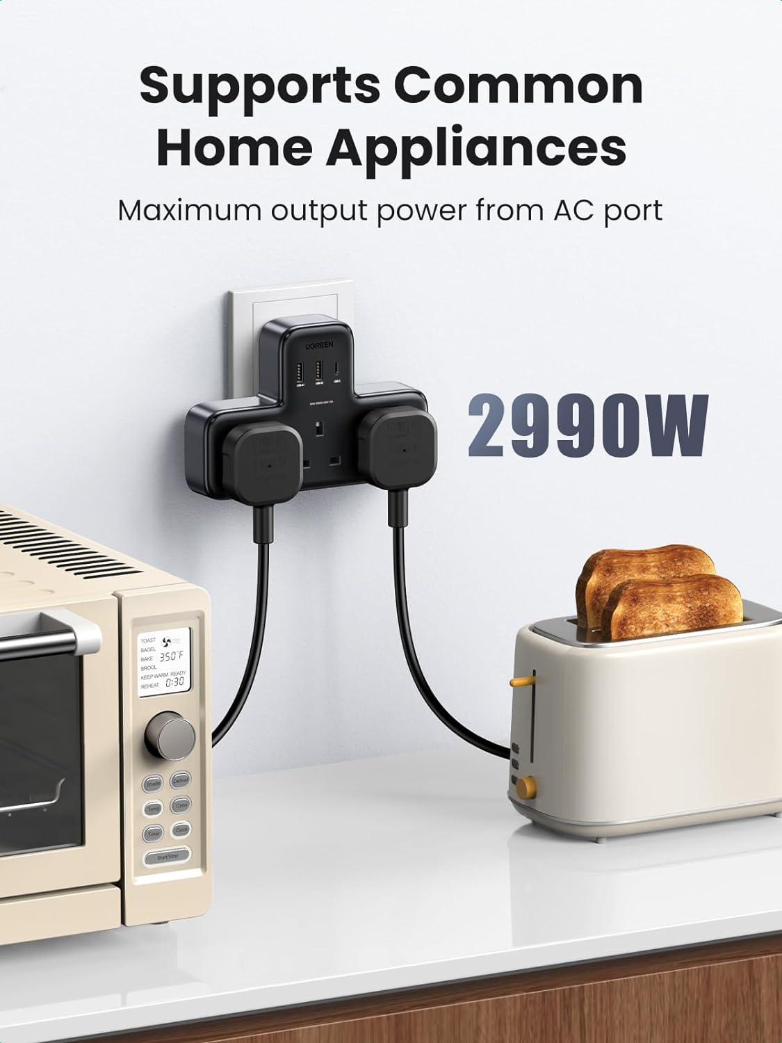 - Non-blocking design: The UGREEN multiplug socket has a smart design. The wide spacing between the three AC outlets ensures that your devices can be plugged in simultaneously without any interference. The T-shaped design of the multi-plug only occupies one socket on the wall panel, and you still have enough space to place other adapters and extension cords.