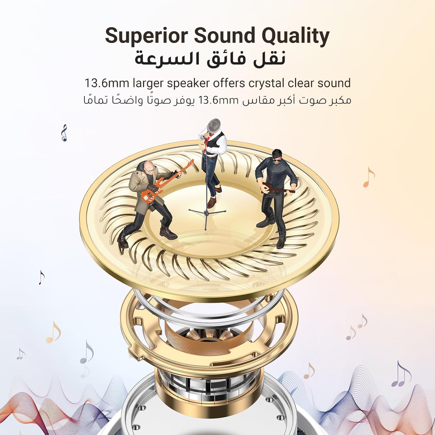 13.6mm driver diameter speaker with crystal clerar treble, vibrant mid-range, mellow and powerful bass.