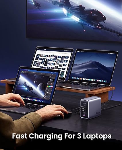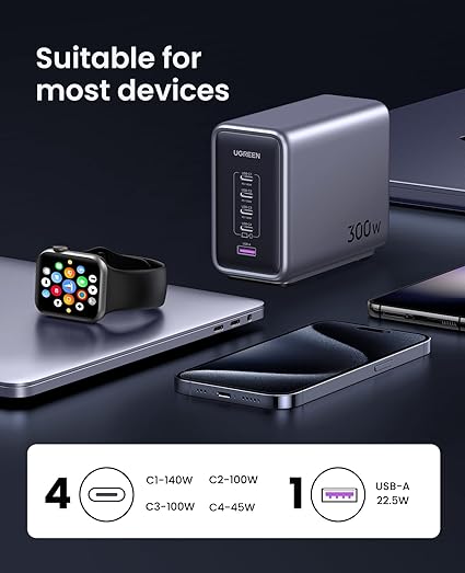- Full power for 3 laptops: Thanks to the excellent charging performance, the GaN Charger can power 3 laptops at the same time. With 4x USB-C & 1x USB-A, the 300W USB C power supply charges 5 devices from laptops to tablets to smartphones at the same time, making you more productive in the office. A charging station for everything!