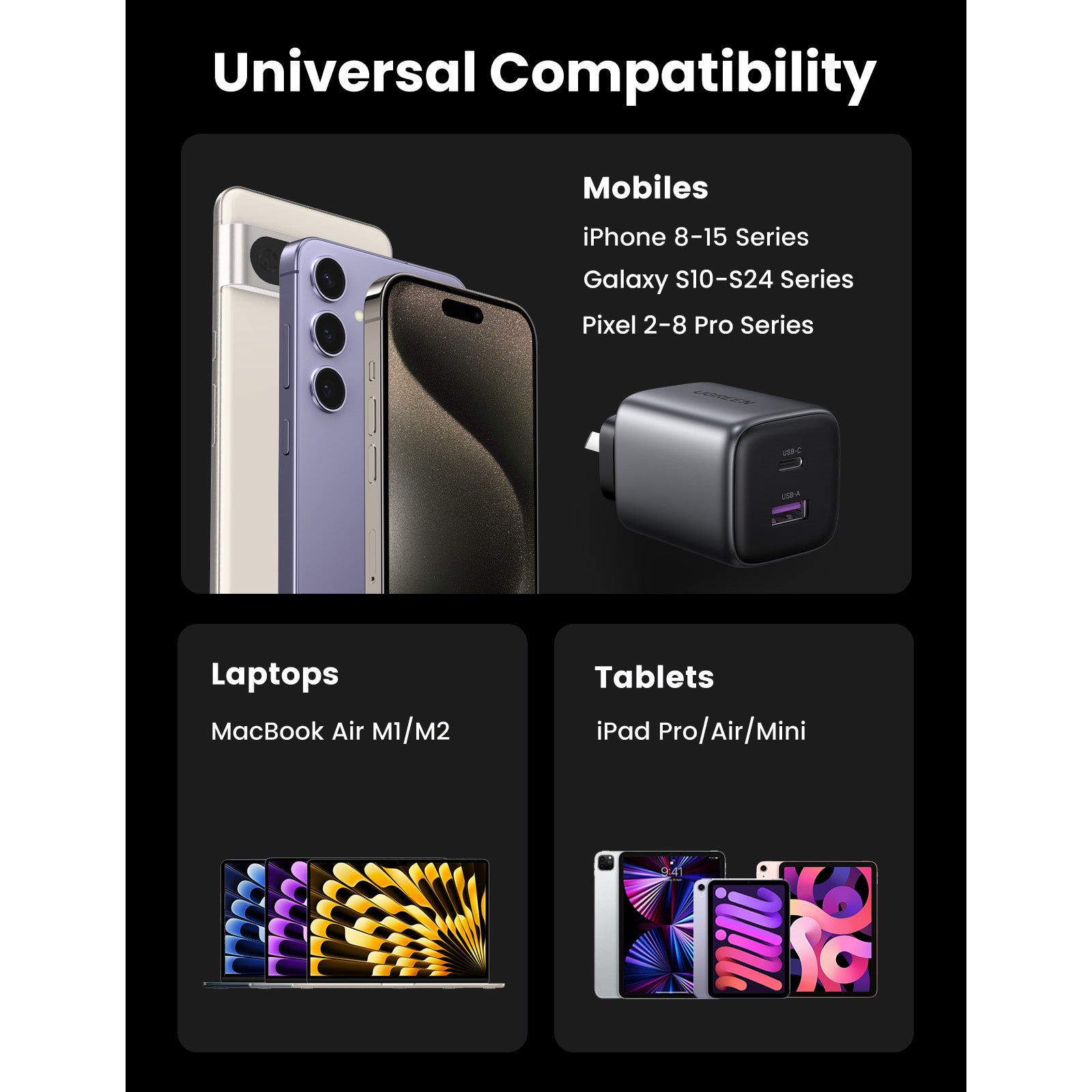 - A Nexode for everything: Along with multi-fast charging protocols for new generation smartphones and improved PPS adaptive charging, 35W Nexode gets the compatibility that other power supplies simply don't give. Compatible with iPhone 15, 15 Plus, 15 Pro Max, 15 Pro, 14, 14 Pro Max, 13, 13 Mini, 12, SE 2022, 11, X; MacBook Air, Watch 8, 7, Watch SE, HomePod, MagSafe; iPad Pro / Air /mini; MacBook Air M1, AirPods Pro; Pixel 7, 6, Galaxy S24 Ultra, S23, S22, S2221 FE, S20, A53, A52, Tab A8, A7, S8