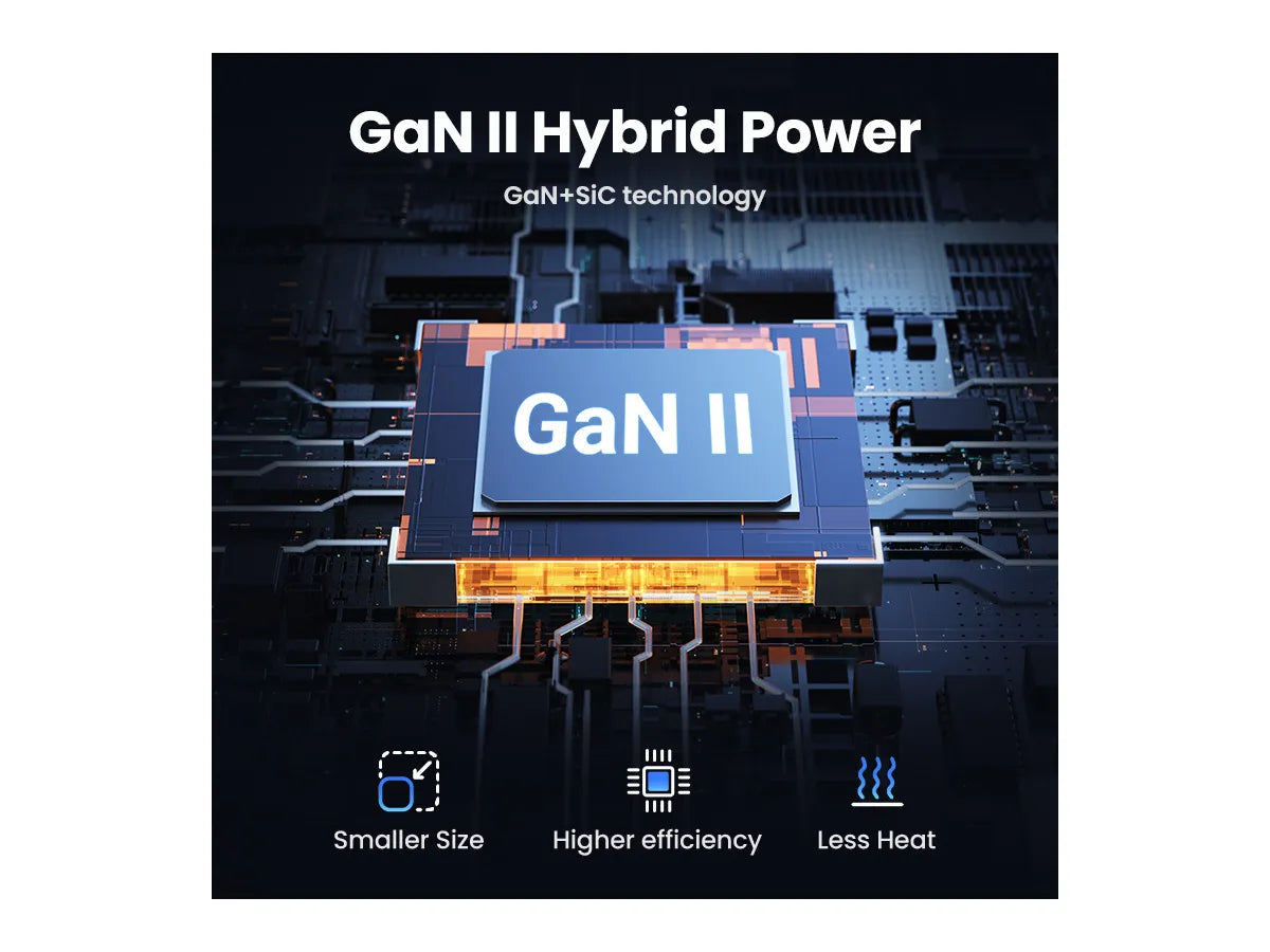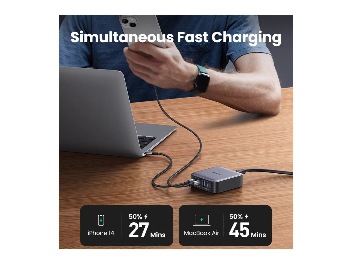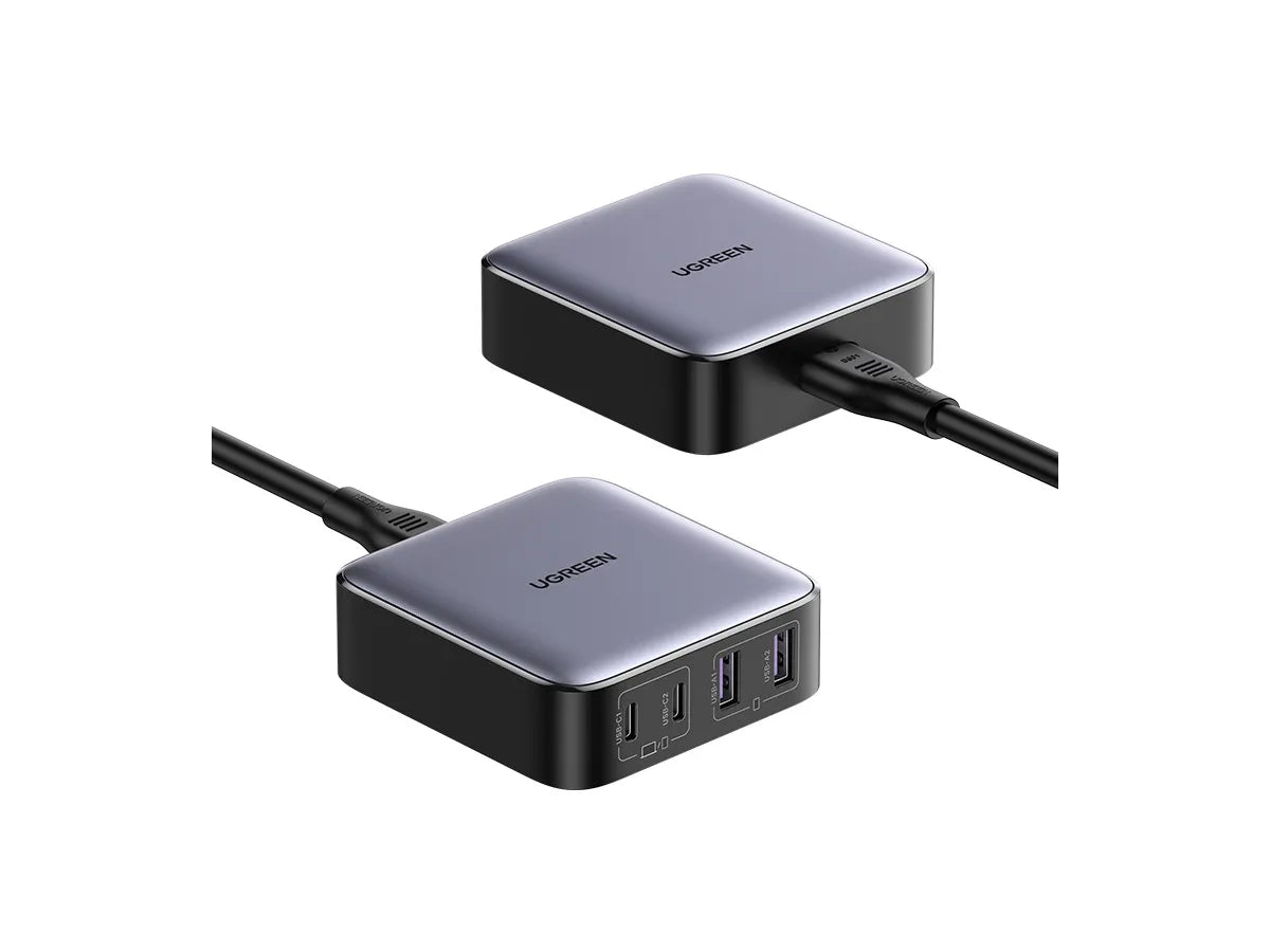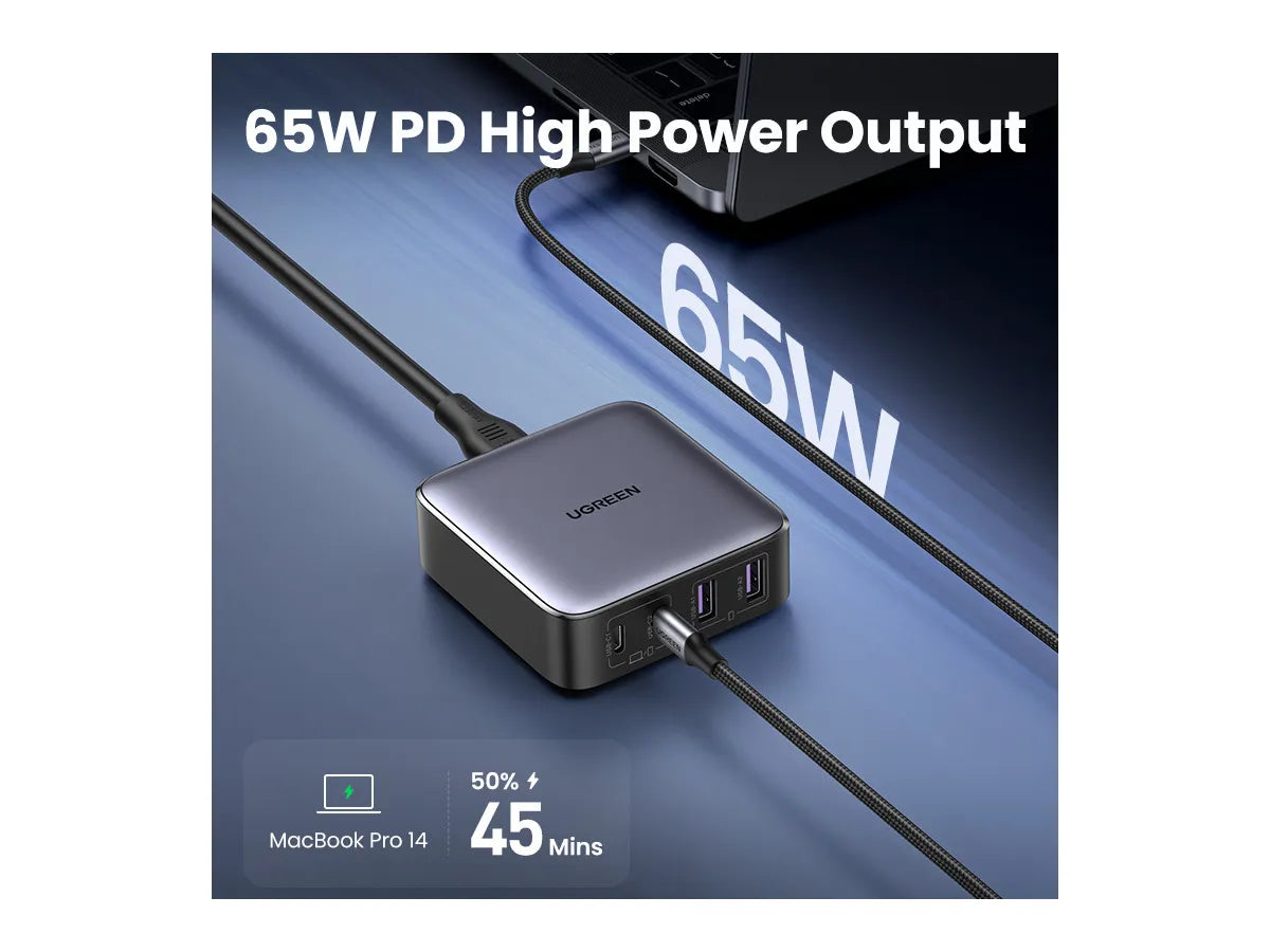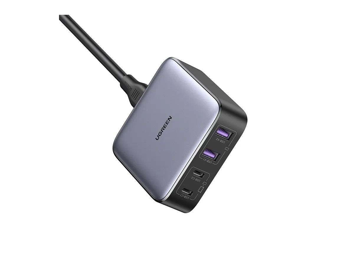 UGREEN Nexode 65W USB C GaN Table Charger offers rapid charging for various devices, including MacBook Pro 14 inches, reaching full battery in just 1.5 hours. With a maximum output of 65W, it efficiently powers up your gadgets. Featuring 2x USB-C and 2x USB-A ports, it accommodates up to 4 devices simultaneously, ensuring convenience and versatility. Its 2-meter-long power cord enhances flexibility for charging at home or in the office. UGREEN's Thermal Guard Tech & Power Dispenser system guarantees safe charging by monitoring temperature in real-time and adjusting power output intelligently, preventing overheating and prolonging battery life. Designed with a PC fireproof case, this charger prioritizes safety while delivering high-performance charging. Benefit from UGREEN ) Nexode 65W USB C GaN Table Charger's efficiency and reliability.