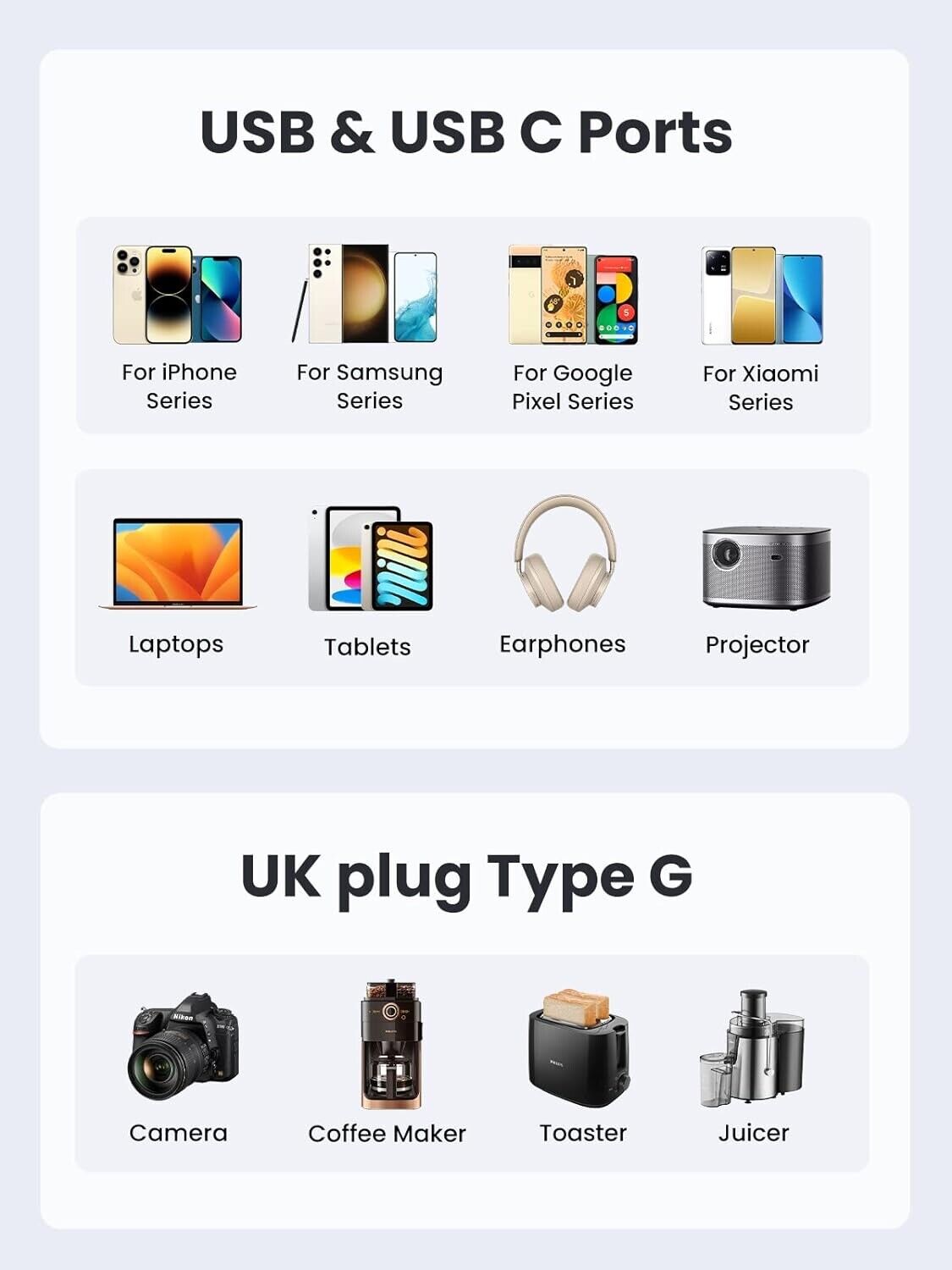 - 【4-in-1 Charger Plug, Perfect Travel Combination】1 Type G Socket + 3 USB ports, easily fast charge up to 4 devices. Just plug the USB charger adapter to wall and gain peace of mind while charging your appliances and mobile devices.