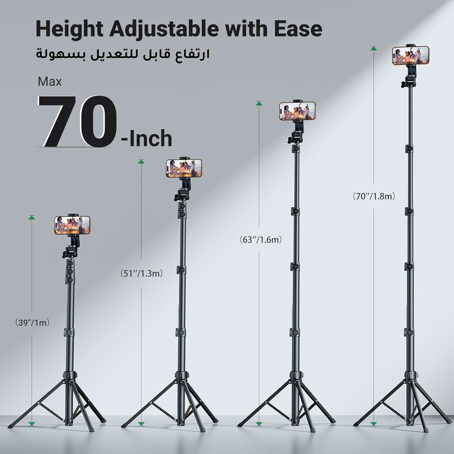 Extra Tall 67" Adjustable Tripod With 4-section adjustable telescopic poles, the phone selfie stick tripod stand is tall enough, can be adjusted from 19in to 70in. Therefore, this selfie stick for Phone can capture a wider landscape and meet the needs of people who want to have different shoot heights and apply it in different scenes, even for the tall man. Suitable for selfies, vlog, live streaming, group photos and more.