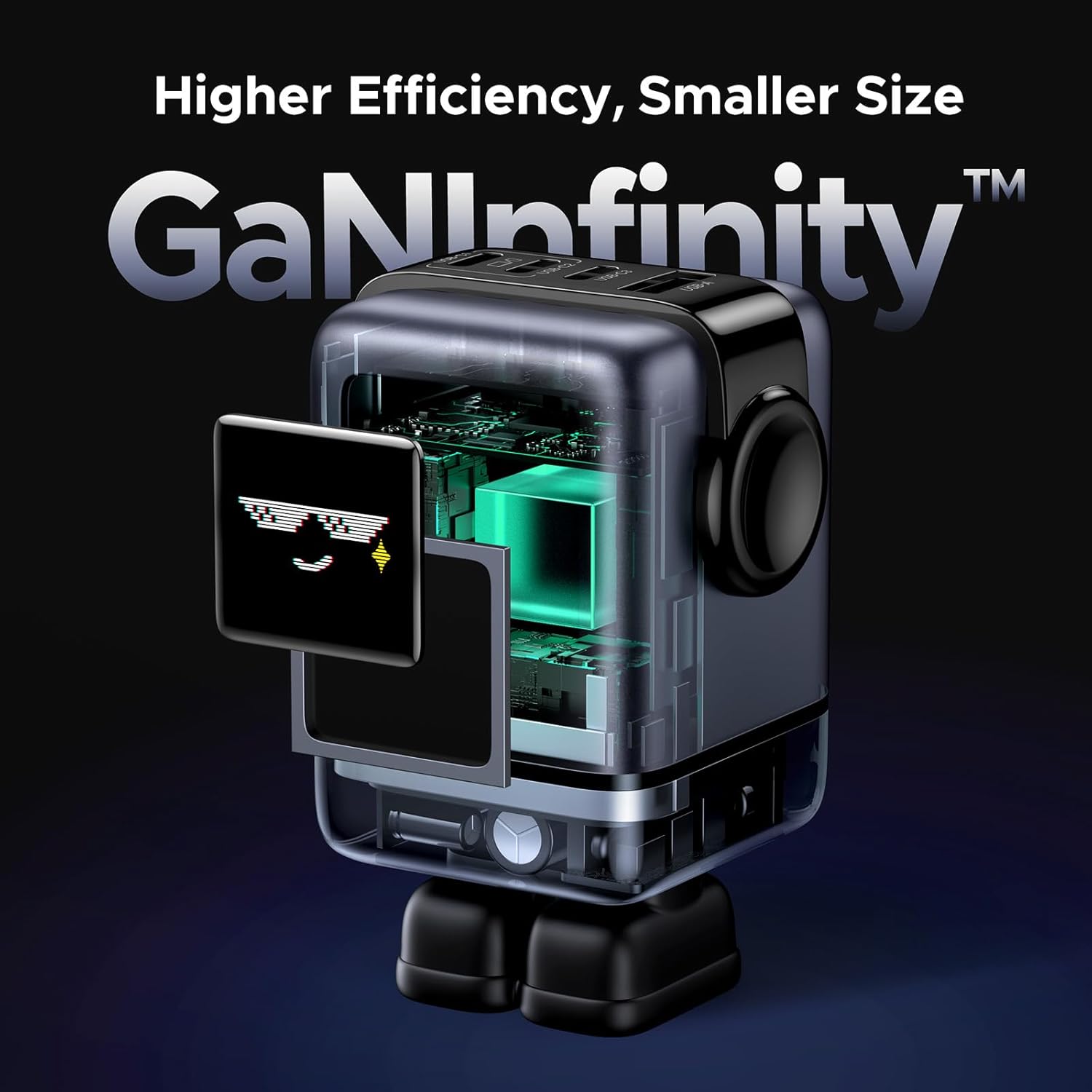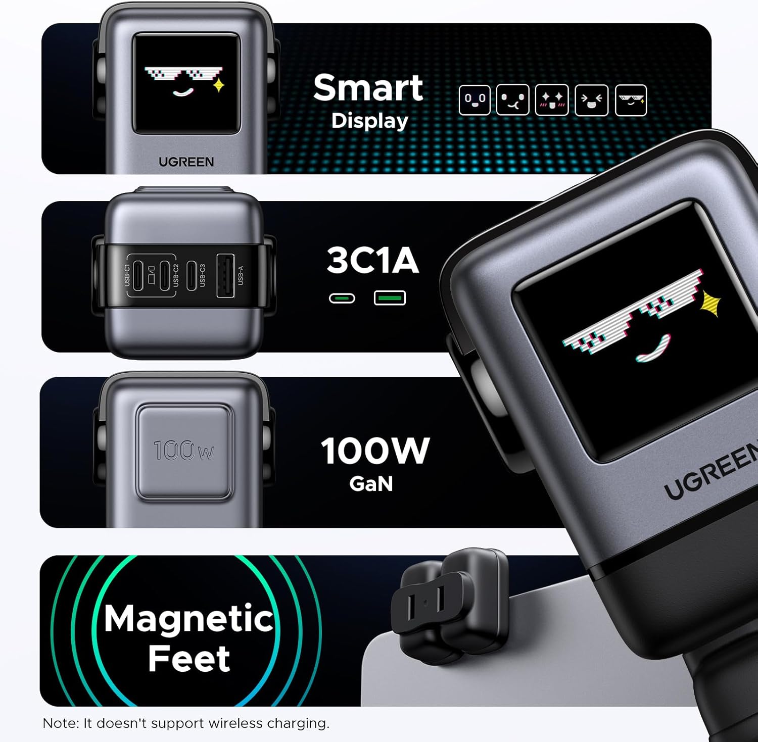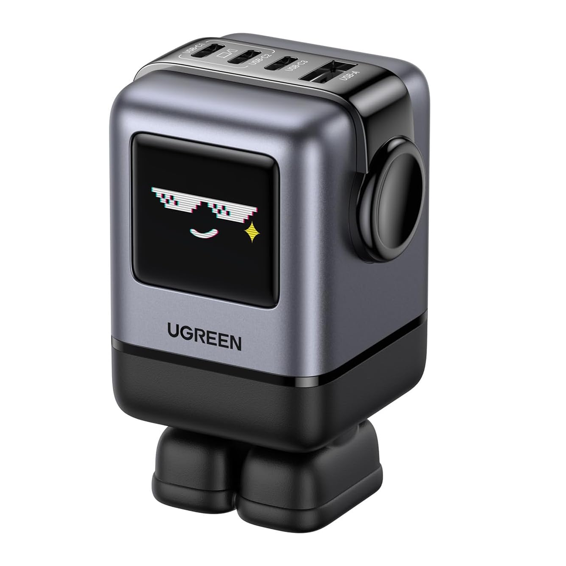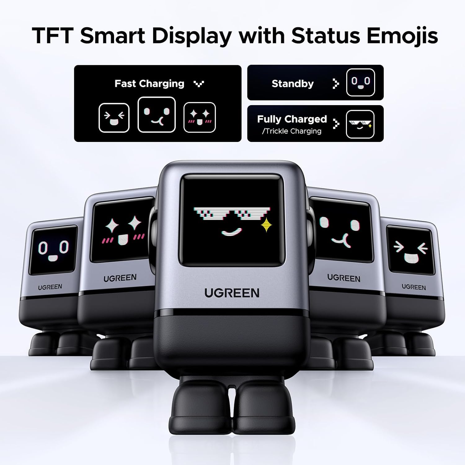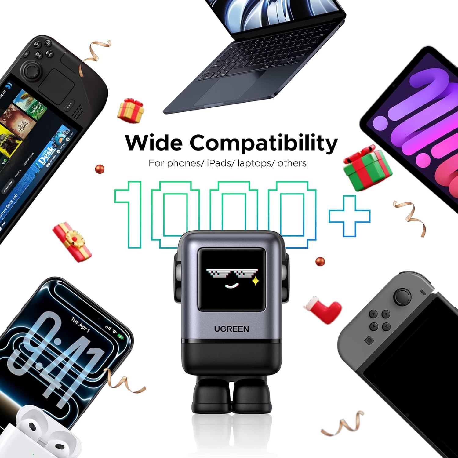 Groovy Robot Design: UGREEN creative series charger, robot shape, TFT screen upgraded from LED, so it shows more interesting expressions according to different charging status. Its feet are magnetic which can be stuck to the laptops without losing it( Note: The expression will only appear when the power is on.)