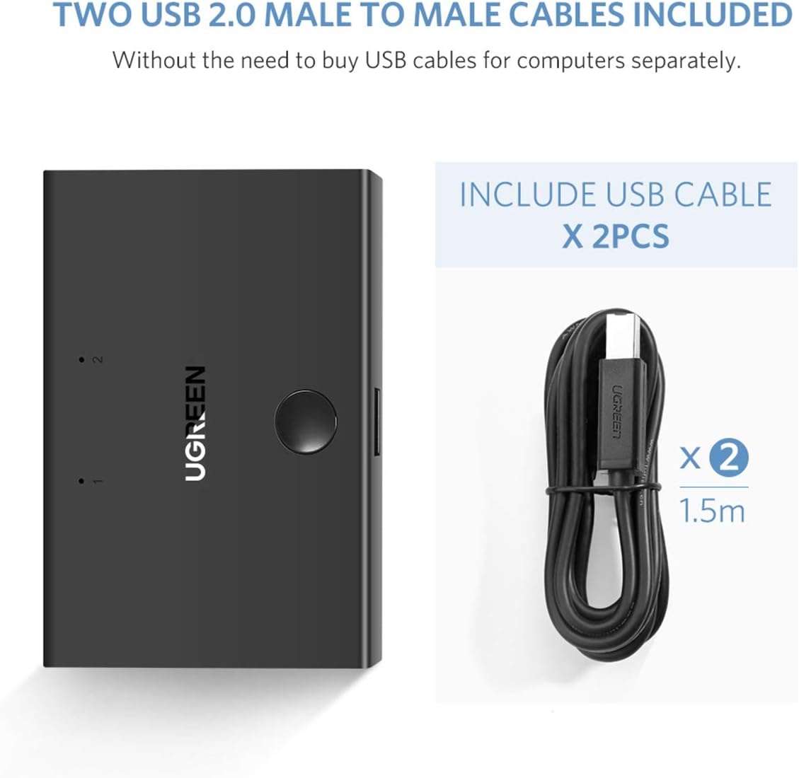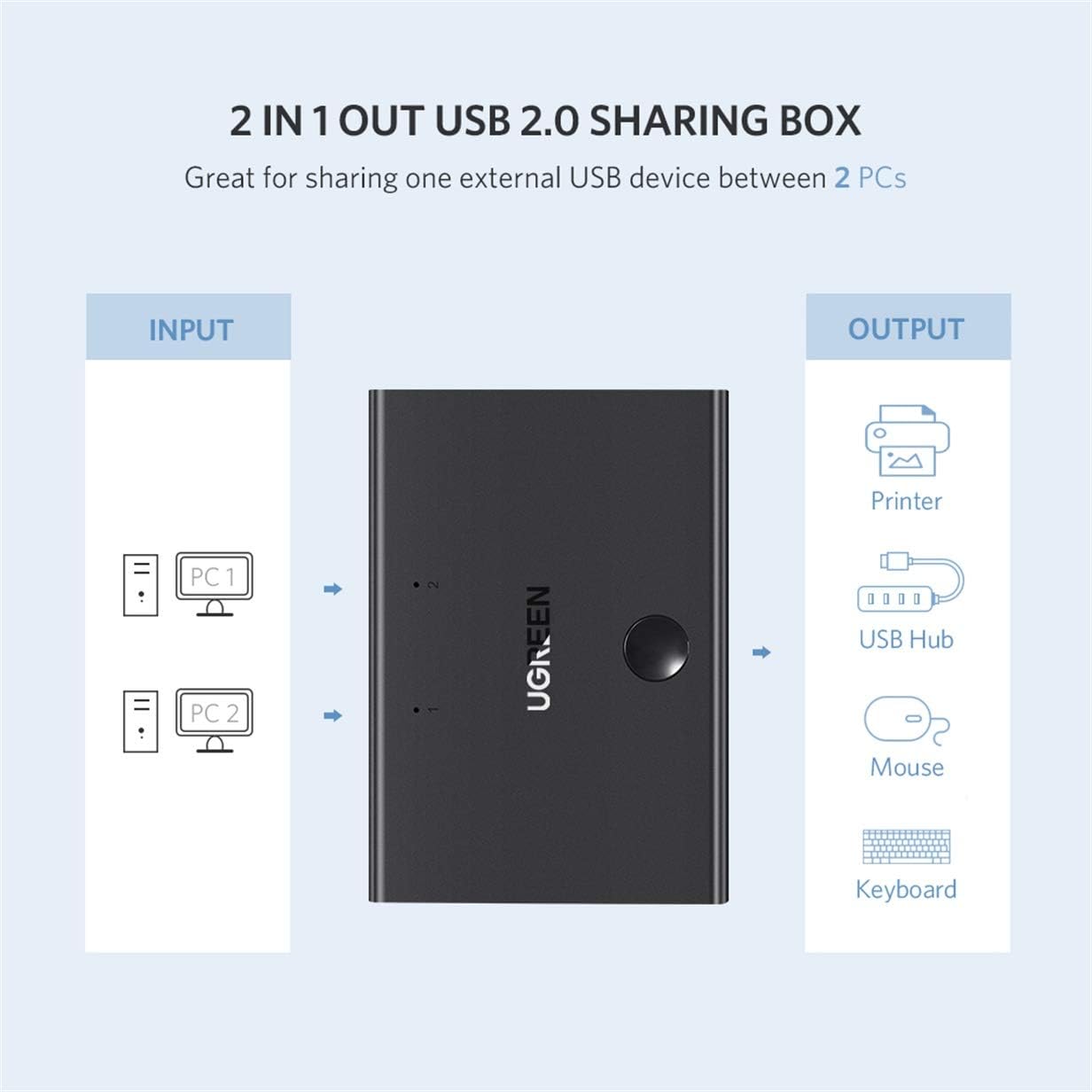 UGREEN USB Sharing Switch USB 2.0 Peripheral Switcher Adapter Box 2 Computer Share 1 USB Device Hub for Printer Scanner with 2 Pack USB 2.0 Male Cable (Black)