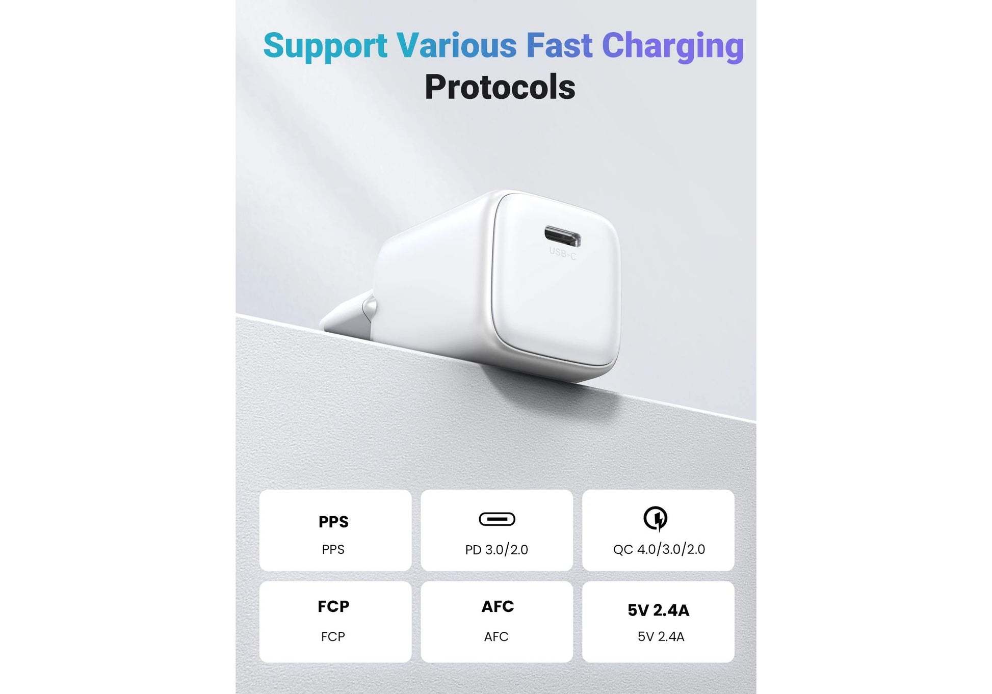 - [30W USB C Charger] The USB C charger supports the maximum power of 30W, backwards compatible with 25W and 20W. It supports multiple fast charging protocols such as PD 3.0, PPS, QC 4+/ 4.0/ 3.0 and SCP, FCP, AFC to be compatible with smartphones, tablets, etc.