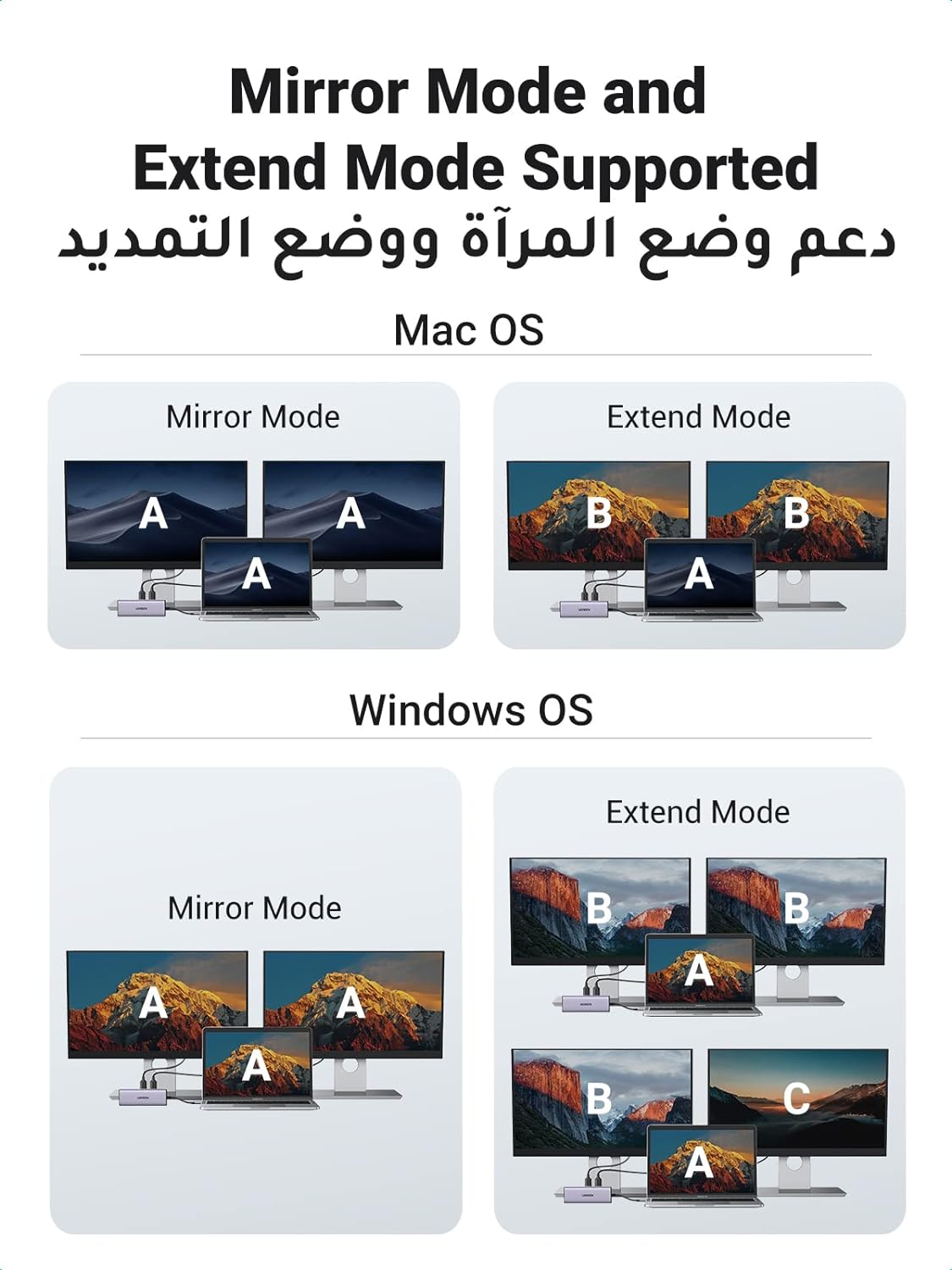 - 【Crystal Dual 4K HDMI Video】This USB C to HDMI hub has dual HDMI ports, allowing you to display the content of your laptop to 2 monitors. Single-use HDMI 1 can up to 4K@60Hz under DP1.4 source, and dual-use HDMI maximum output up to 3840*2160@30hz resolution. Attention: It ONLY supports MIRROR MODE on the Apple Mac OS system which is limited by Mac itself.