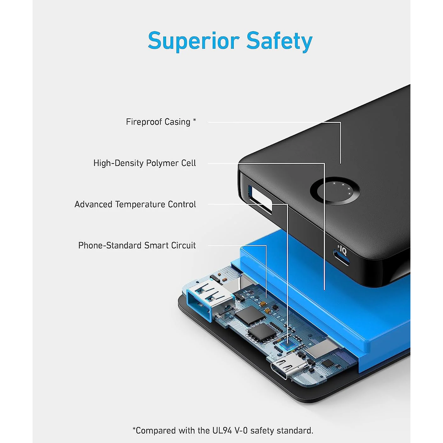 آمن للغاية للاستخدام: مع غلاف مقاوم للحريق* وخلية بوليمر عالية الكثافة ودائرة ذكية والتحكم في درجة الحرارة، يوفر بنك الطاقة هذا حماية موثوقة أثناء شحن أجهزتك.