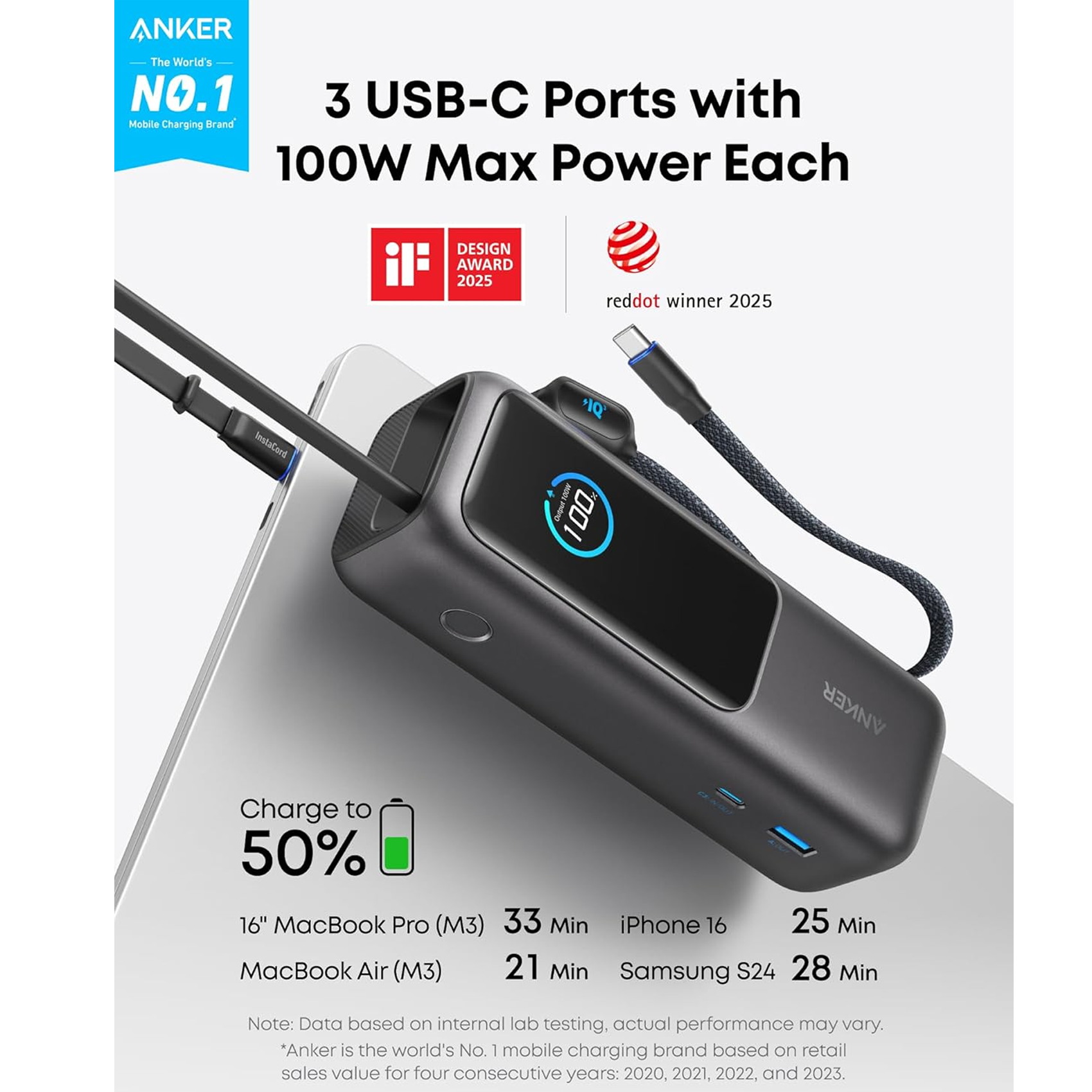 ما تحصل عليه: بنك الطاقة Anker (25K، 165W، كابلات مدمجة وقابلة للسحب)، حقيبة واقية، دليل المستخدم، ضمان لمدة 18 شهرًا، وخدمة العملاء الودودة لدينا.