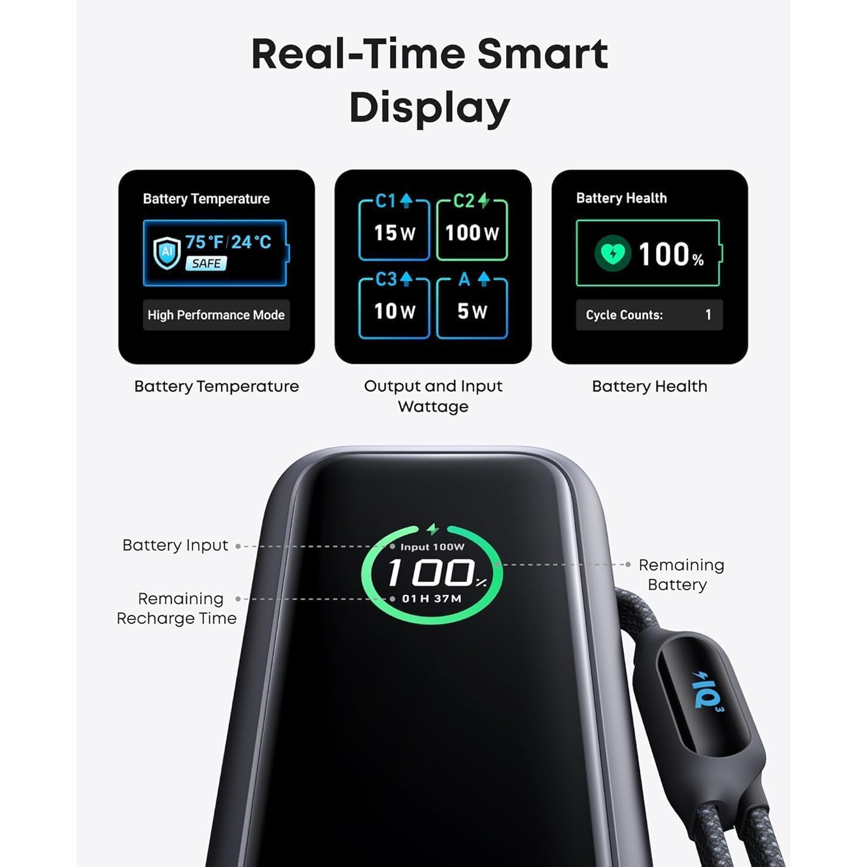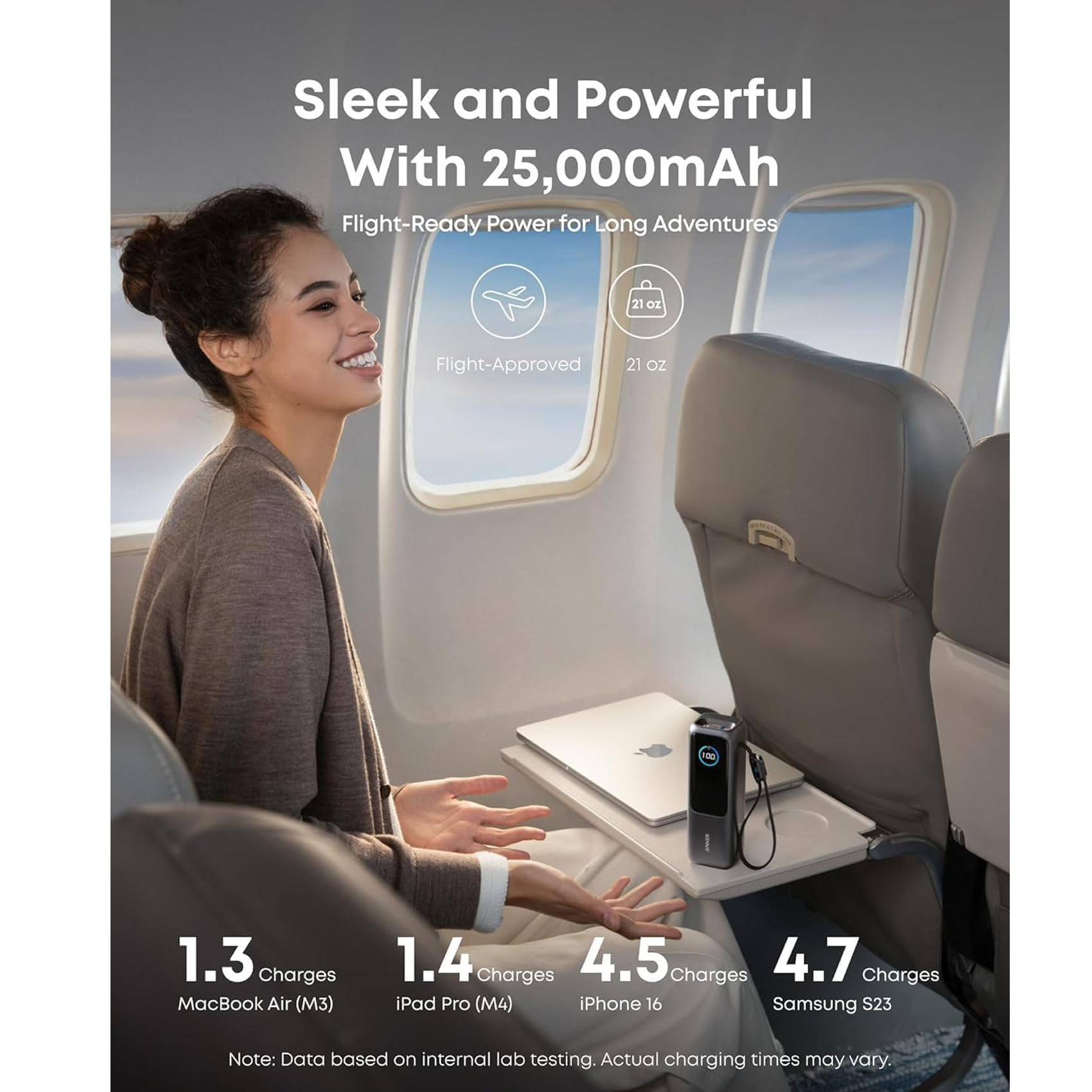 طاقة ٢٥,٠٠٠ مللي أمبير/ساعة لرحلات طويلة: انطلق في رحلات طويلة مع سعة هائلة تبلغ ٢٥,٠٠٠ مللي أمبير/ساعة، تدعم أجهزتك لاستخدامات متعددة، مع شحن فائق السرعة بقوة ١٠٠ واط، يشحن بنك الطاقة إلى ٣٠٪ في ٢٢ دقيقة فقط. (ملاحظة: يتوافق بنك الطاقة هذا، بقوة ٩٠ واط/ساعة، مع لوائح حمل البطاريات التي تقل سعتها عن ١٠٠ واط/ساعة، ويجب وضعه في الأمتعة اليدوية).