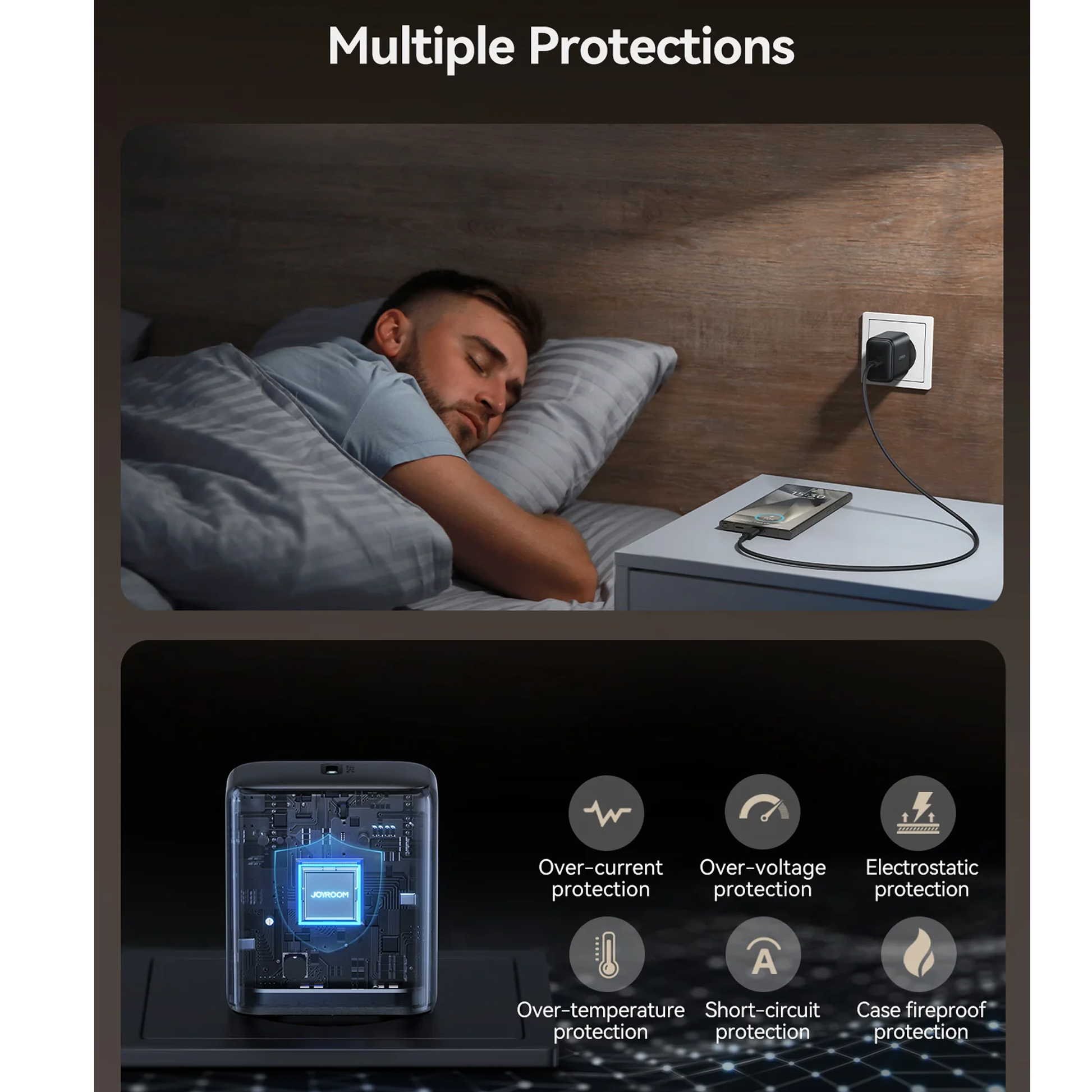 مجهزة بـ ست طبقات من الحماية ، يضمن هذا الشاحن شحنًا آمنًا ومستقرًا، ويحمي من الحرارة الزائدة، والجهد الزائد، والحمل الزائد.