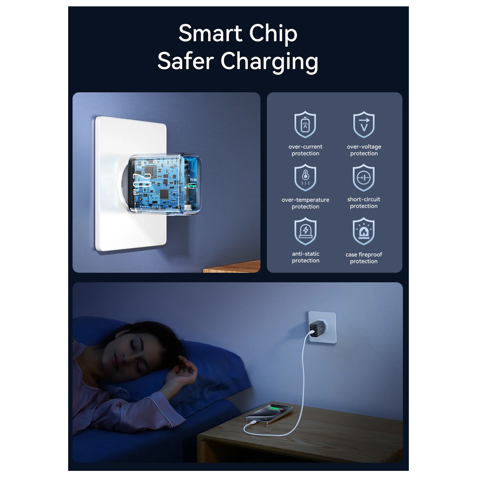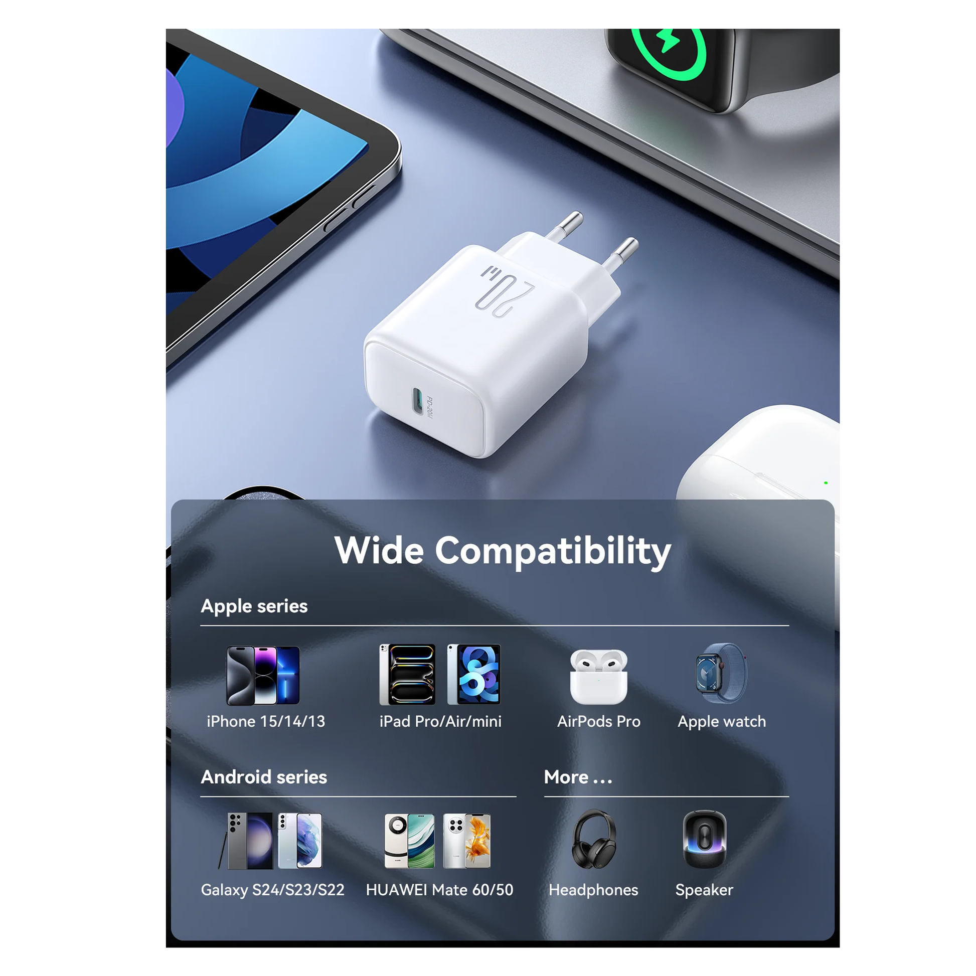 Joyroom JR-TCF20 هو شاحن USB-C صغير الحجم وفعال بقوة 20 وات مصمم لتوفير شحن سريع وآمن لمجموعة متنوعة من الأجهزة. ويدعم بروتوكولات الشحن السريع المتعددة، مما يضمن التوافق مع مجموعة واسعة من الهواتف الذكية والأجهزة اللوحية. إن تصميمه خفيف الوزن وميزات السلامة القوية تجعله خيارًا مثاليًا للاستخدام اليومي.