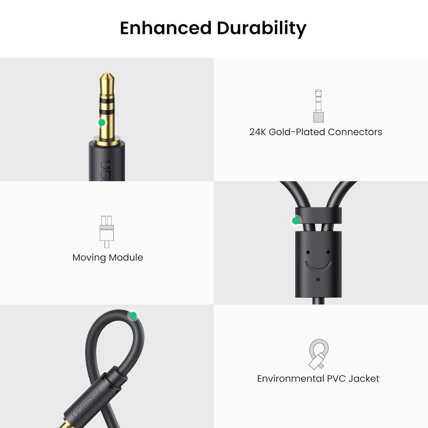 متانة مُحسّنة: سلك UGREEN RCA أنثى إلى 3.5 مم ذكر مُصمم ليدوم طويلًا. سلكا RCA أنثى إلى AUX اجتازا أكثر من 10000 اختبار انحناء، ويتحملان أي التواء أو شد أو تشابك. موصلات مطلية بالذهب وأغطية نحاسية مقاومة للتآكل وتضمن جودة صوت مثالية.