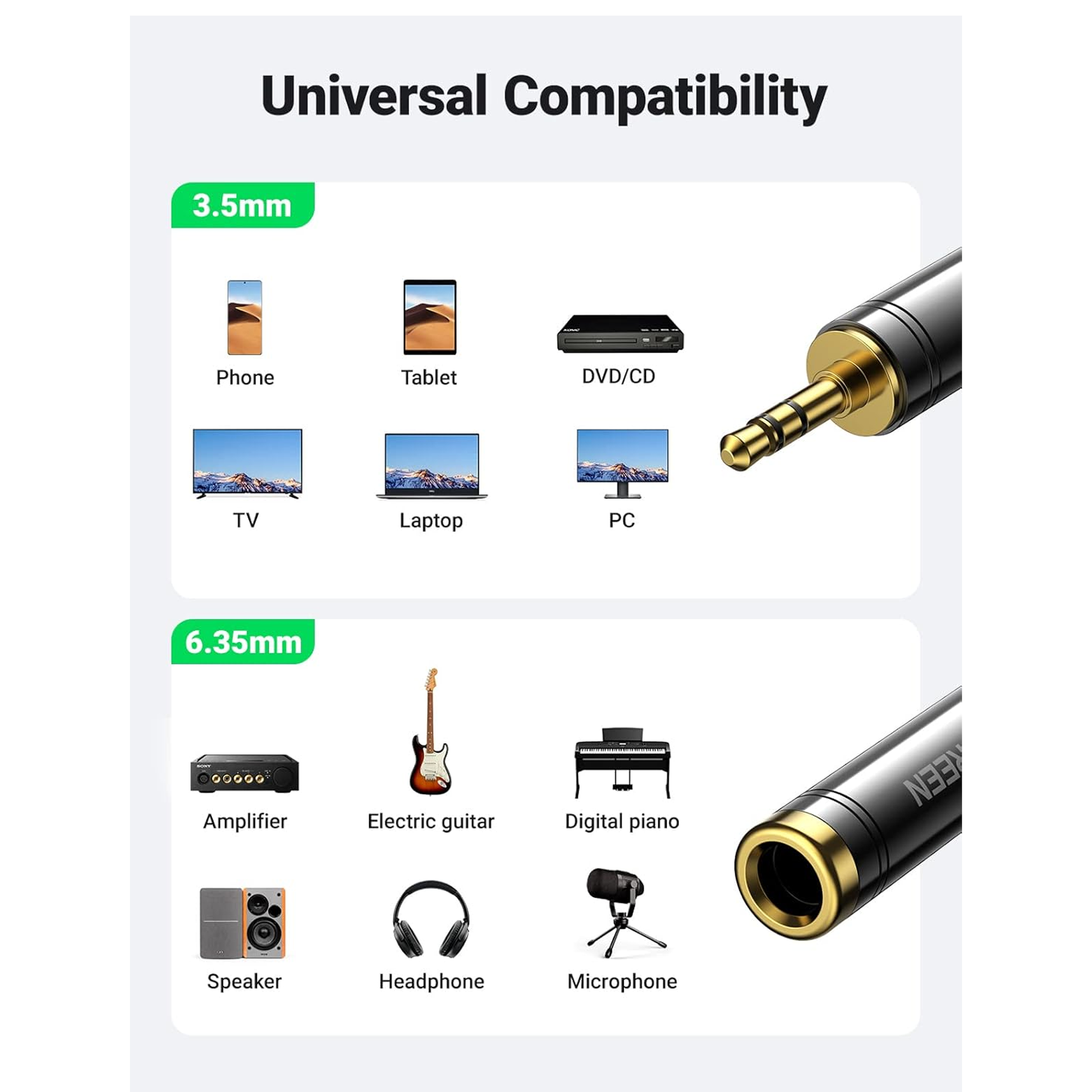 التوافق العالمي: مقبس جاك 6.35 مم متوافق مع معظم معدات الصوت الاحترافية والمنزلية، مثل مكبرات الصوت ووحدة التحكم في الخلط وأجهزة المسرح المنزلي أو أجهزة استقبال AV والجيتار الكهربائي والبيانو الرقمي وما إلى ذلك. يدعم مقبس جاك 3.5 مم الأجهزة ذات مقابس 3.5 مم، مثل الهاتف والكمبيوتر اللوحي والكمبيوتر المحمول وأجهزة MP3 وما إلى ذلك.