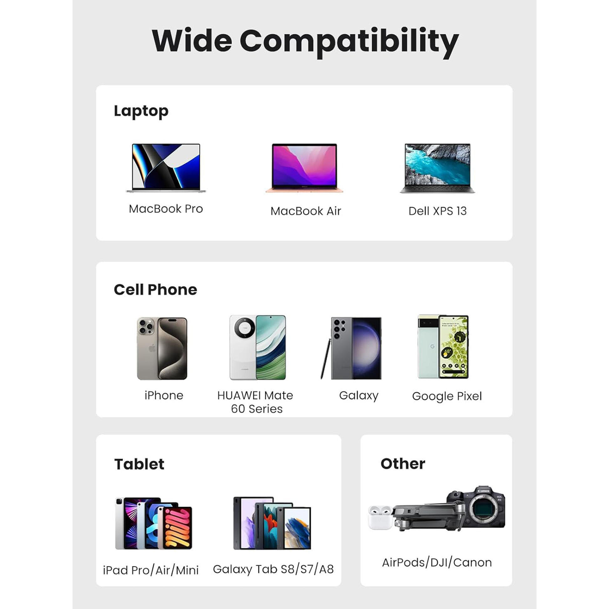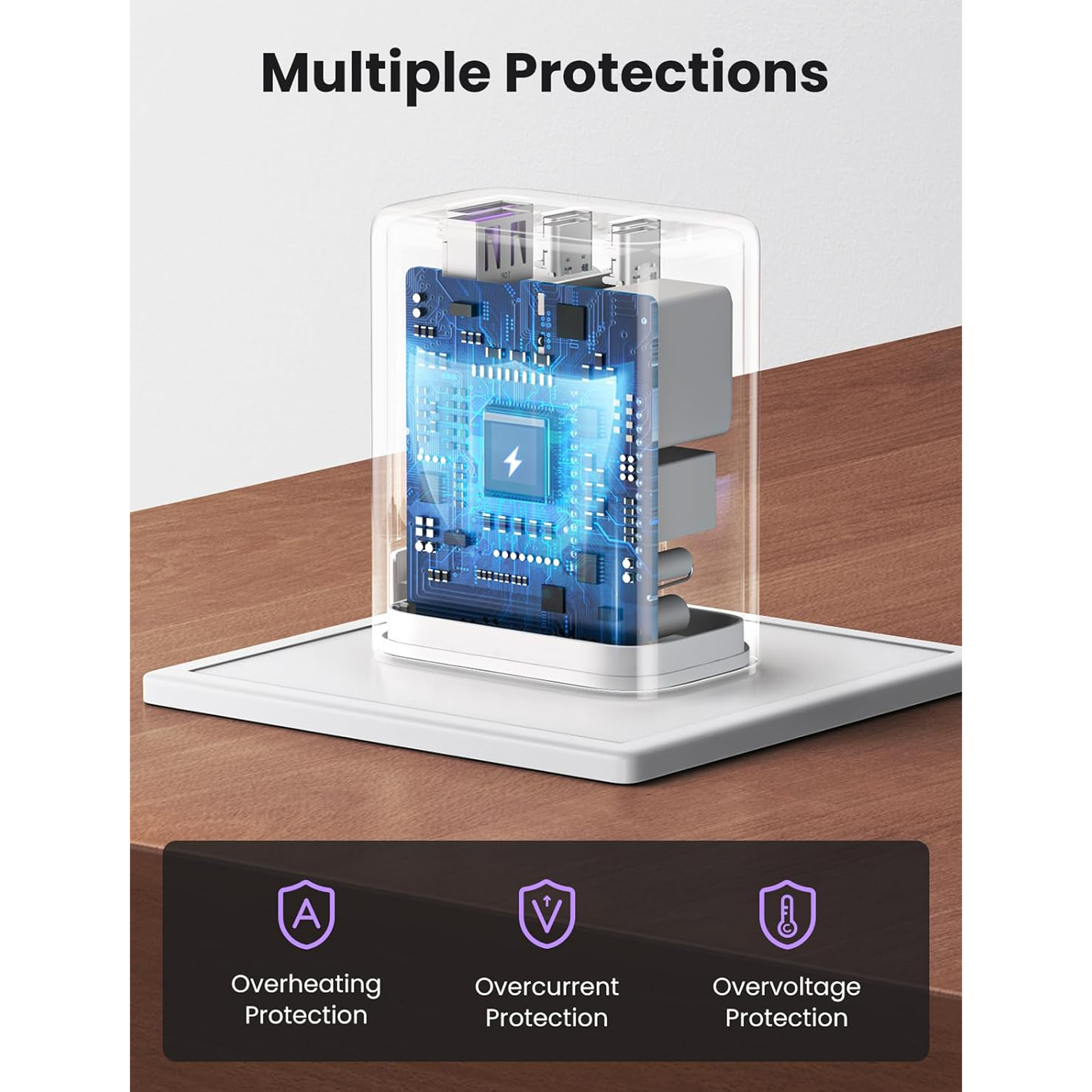 - توصيل طاقة قصوى تبلغ 65 وات: قم بتوصيل جهاز واحد للحصول على 65 وات من الشحن الأقصى، والذي يمكنه تشغيل MacBook Air 2022 M2 بأقصى سرعة من 0% إلى 51% في 30 دقيقة. وعند توصيل ثلاثة أجهزة، سيتم توزيع الطاقة بكفاءة بين المنافذ لضمان حصولك على الشحن الأمثل.