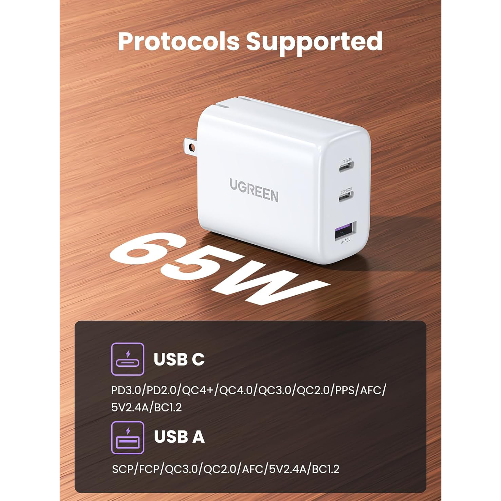 شاحن يو إس بي سي بقوة 65 وات من يوجرين، 3 منافذ، شاحن حائط سريع قابل للطي ومدمج، محول طاقة يو إس بي سي