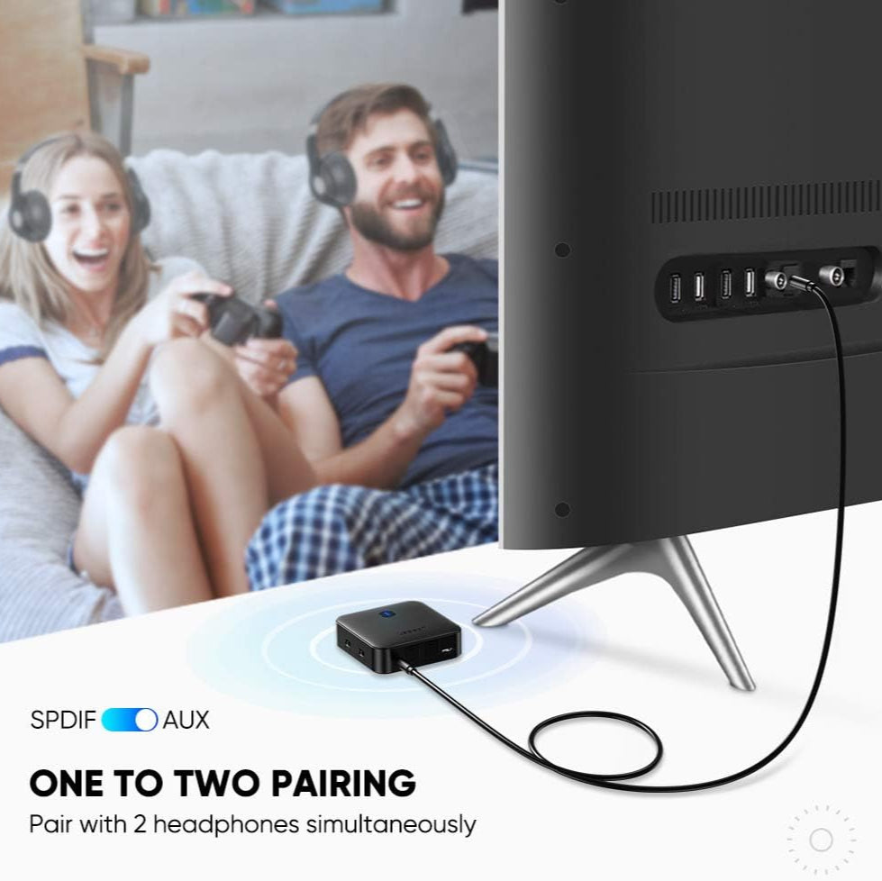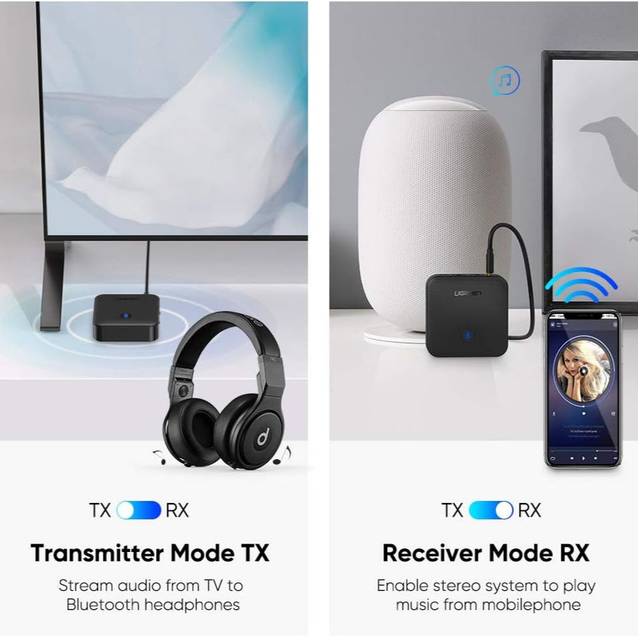 يعمل جهاز إرسال واستقبال UGREEN 2 في 1 aptX Bluetooth Transmitter Receiver كجهاز إرسال بلوتوث لإرسال إشارة الصوت من التلفزيون أو مشغل MP3 أو CD إلى مكبرات الصوت Bluetooth أو سماعة الرأس، والتبديل إلى جهاز الاستقبال لتلقي إشارة Bluetooth من هاتفك الذكي أو جهازك اللوحي أو الكمبيوتر إلى مكبر الصوت غير المزود بتقنية Bluetooth أو مكبر الصوت أو سماعة الرأس، وهو حل سهل لإضافة Bluetooth إلى حياتك الرقمية