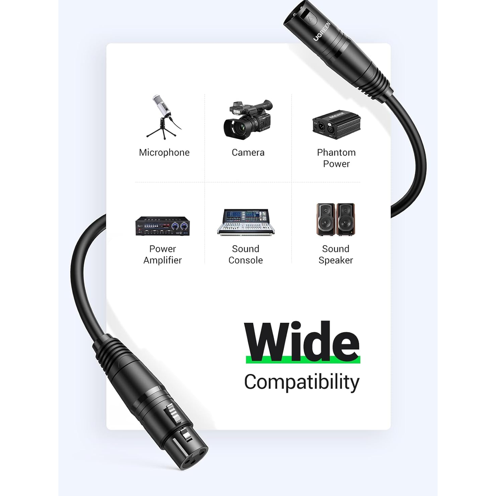 توافق واسع: كابل الميكروفون XLR مزود بموصلات XLR ثلاثية السنون ويعمل بشكل جيد مع أجهزة مقبس أو قابس XLR صغير، مثل نظام PA (نظام العناوين العامة)، ميكروفون مكثف، ميكروفونات البندقية، منسقات الاستوديو، لوحات الخلط، كابينة DJ، لوحات التوصيل، مكبرات الصوت النشطة، الخلاط، إضاءة المسرح، مكبرات الصوت، طاقة وهمية