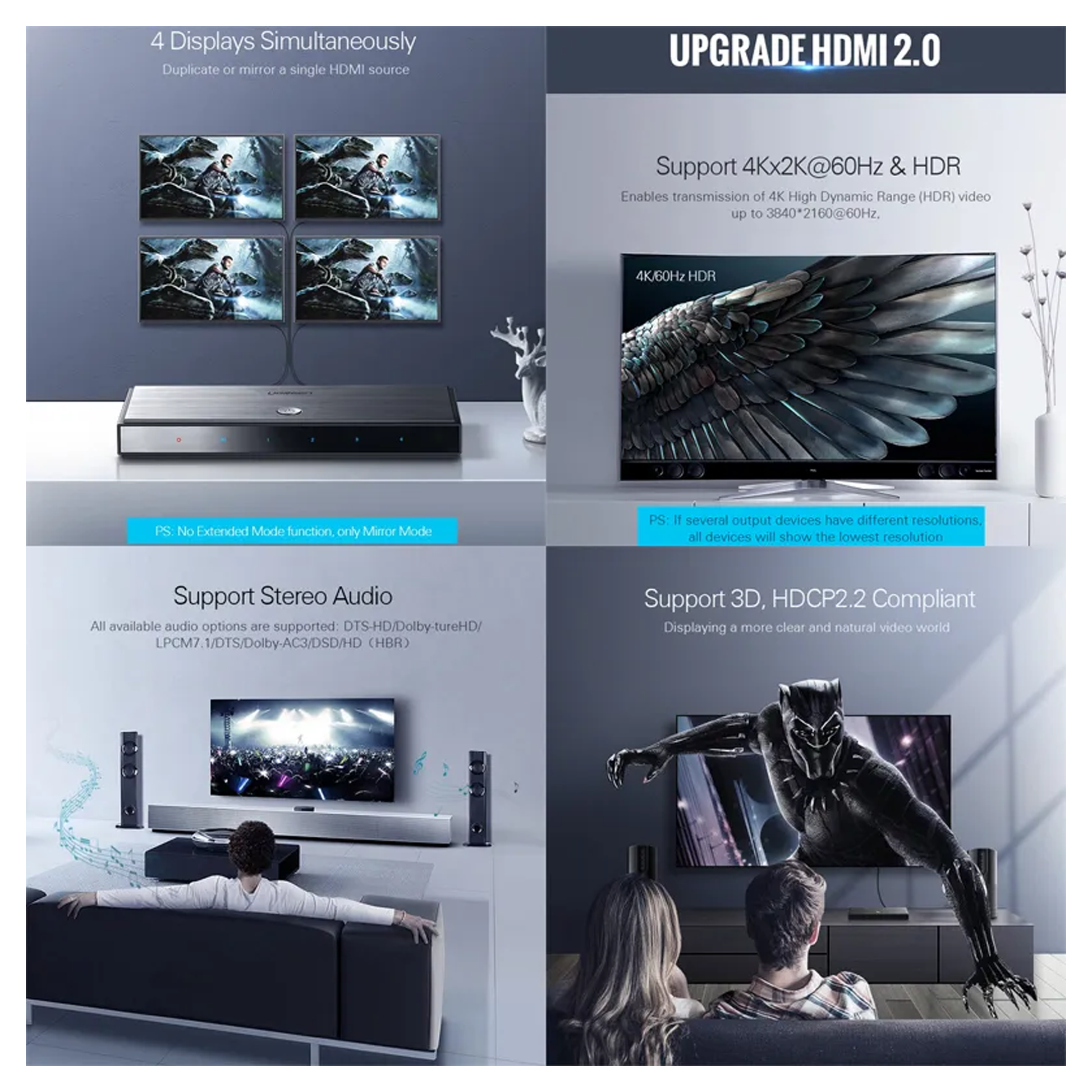 4K Support: If you plan to use this splitter for 4K content, make sure your HDMI cables and devices are also 4K compatible.