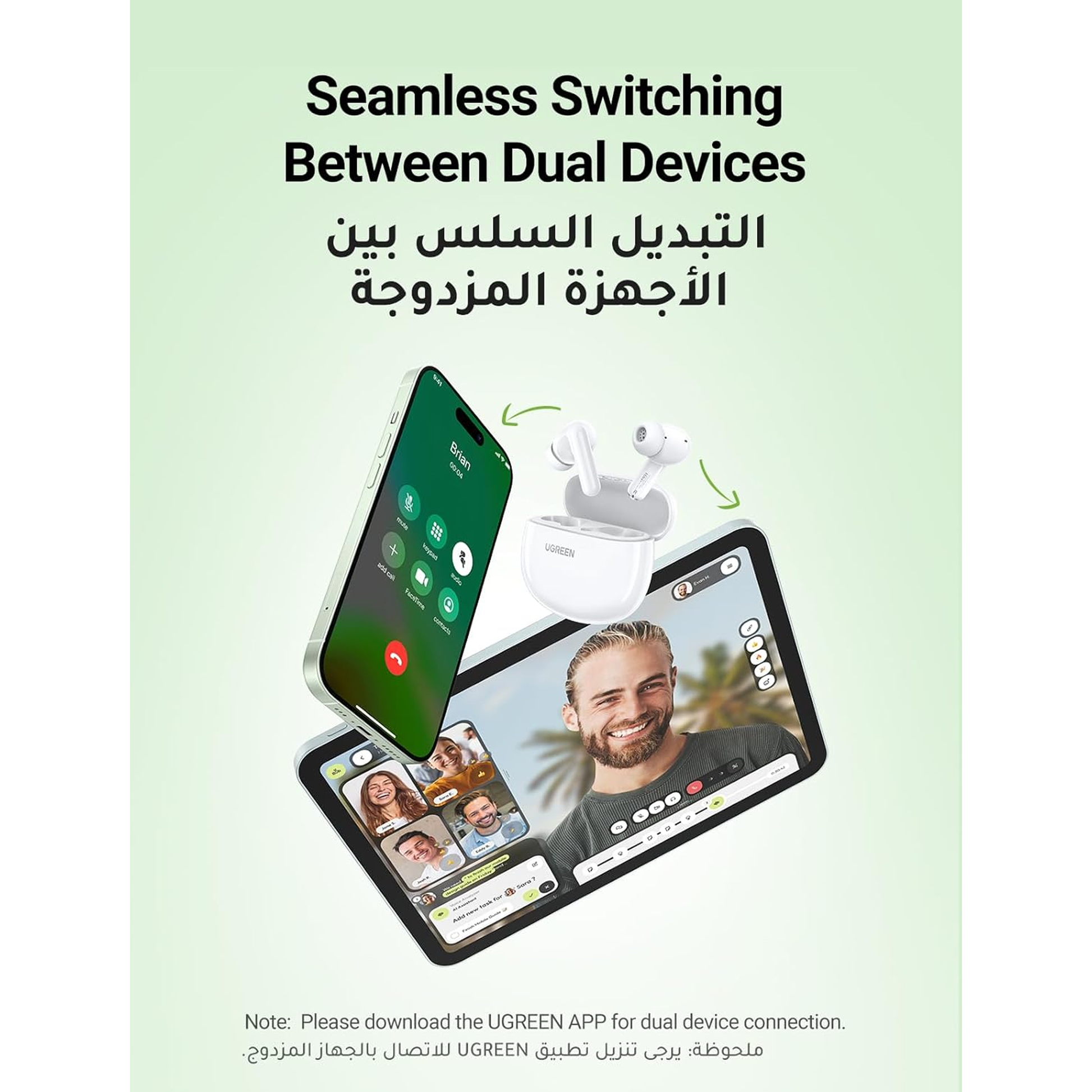 Switch between Two Devices Freely The earbuds allow you to connect two devices simultaneously via the APP so you can switch anytime. NOTE: Please download the UGREEN APP to use this function.