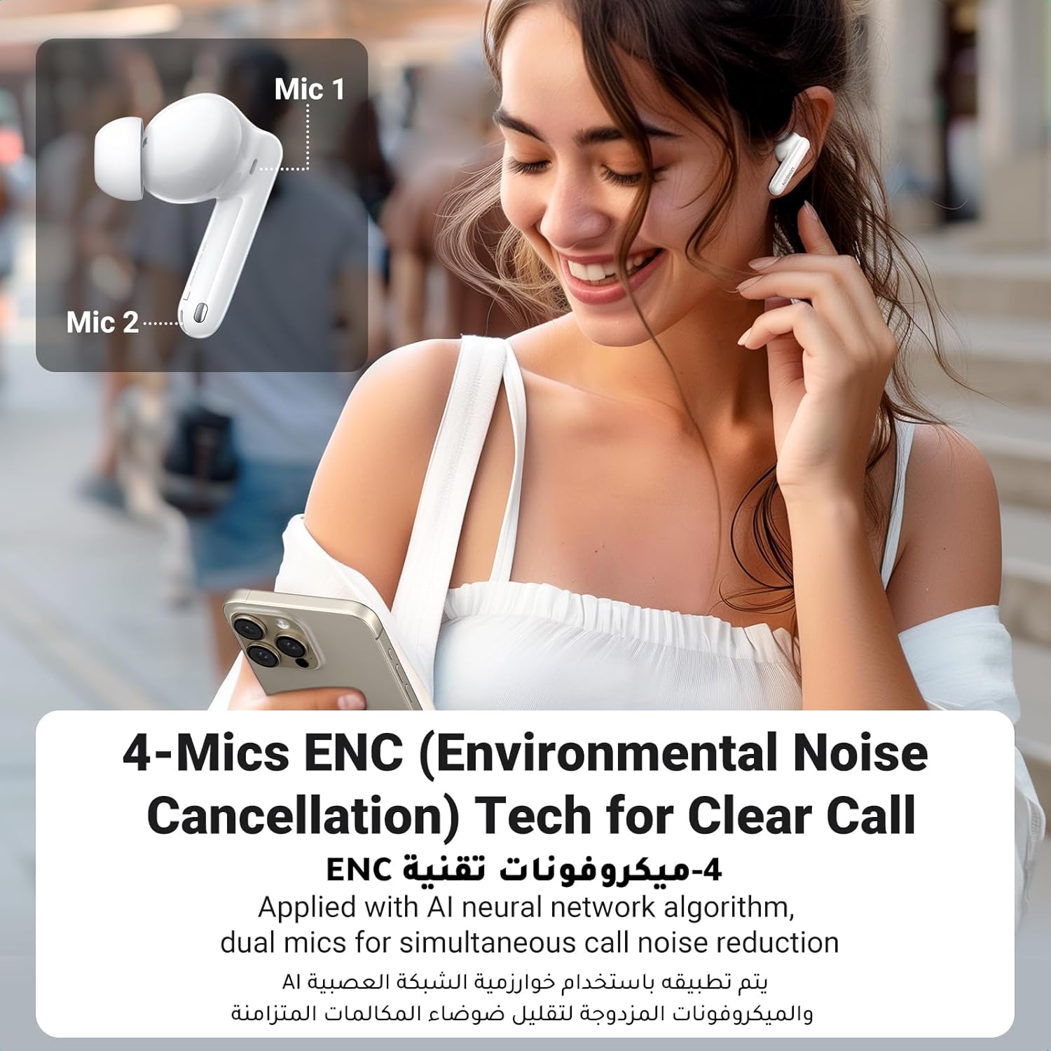 Clear calls without Interruptions Equipped with ENC call noise reduction technology, the earphones have obtained a patent for wind noise reduction. Each earbud has two mics (one for audio reception and the other for noise reduction). Even in noisy outdoor environments, you and the person you are talking to can hear each other.