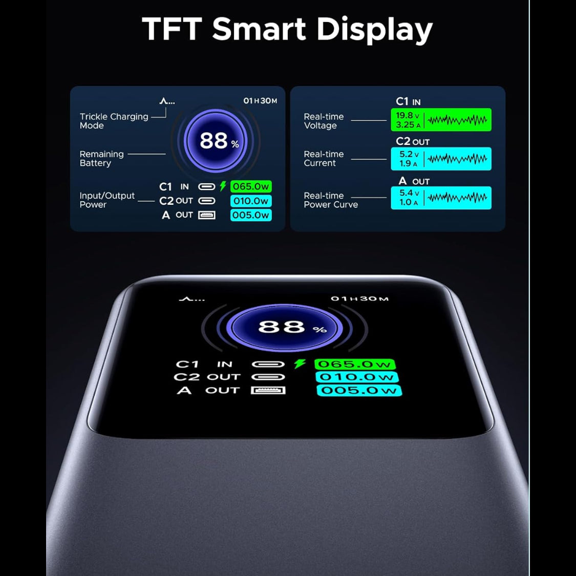 TFT Display: 20000 mAh power bank is equipped with an TFT display which can display real-time information such as battery power, remaining charge time, output/input power, voltage, current, etc., the display content is more delicate, the colors are richer