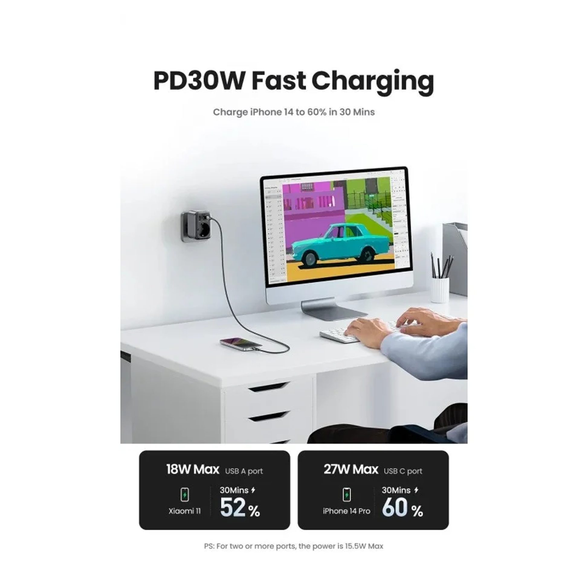 - محول شحن سريع 4 في 1: يجمع مقبس UGREEN PD 30W USB C بين منفذ تيار متردد واحد ومنفذي USB-A ومنفذ USB-C للشحن السريع، مما يضمن أن كل شيء يبدو سلسًا وسهلاً في المنزل عند الشحن السريع. يدعم منفذ USB-C الفردي طاقة شحن تصل إلى 30 وات لأجهزة MacBook Air وiPad وiPhone 14 Pro Max، ويدعم منفذا USB المزدوجان ما يصل إلى 18 وات. الطاقة المقدرة: 3680 وات كحد أقصى.
