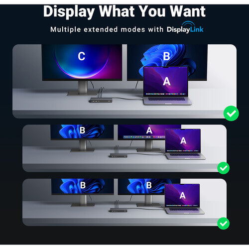 - شاشة الوسائط المزدوجة: استخدم منفذي HDMI ومنفذي DisplayPorts في محطة إرساء الكمبيوتر المحمول لتوصيل شاشتين بدقة 4K@60Hz بجهاز MacBook الخاص بك، ويمكن لكل شاشة عرض محتوى مختلف لجعل تعدد المهام أمرًا سهلاً.