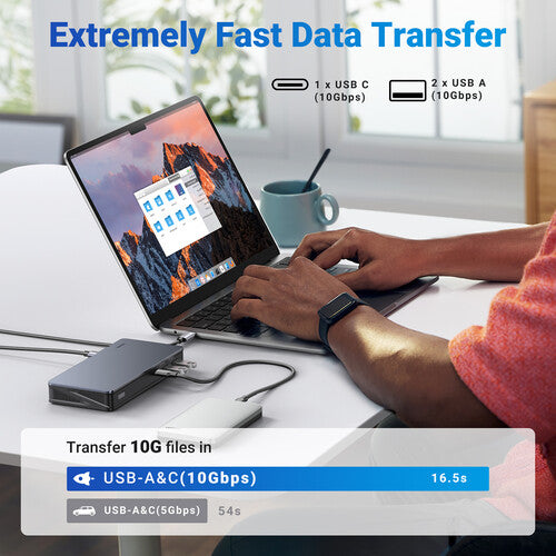 - نقل الملفات في ثوان: مع 3 منافذ USB 3.2 Gen2 على UGREEN USB C Dock، وهو مزيج من USB-A وUSB-C، توفر جميع منافذ USB أداءً يبلغ 10 جيجابت في الثانية، وهو ما يكفي لنقل ملف بحجم 10 جيجابايت في ما يزيد قليلاً عن 16 ثانية.