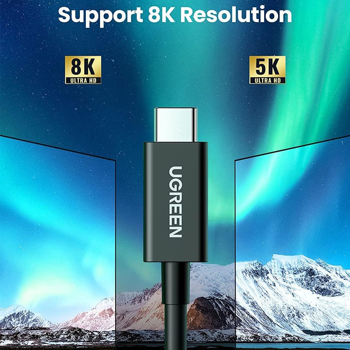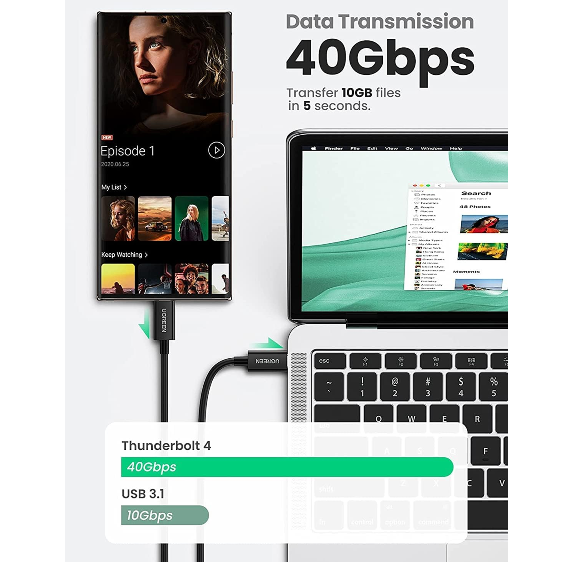 نقل بيانات فائق السرعة 40 جيجابت في الثانية: يوفر كابل UGREEN Thunderbolt 4 بسرعة 40 جيجابت في الثانية سرعة نقل بيانات أسرع 4 مرات من USB 3.1 Gen 2، حيث ينقل 10 جيجابايت من الموسيقى أو الأفلام أو مواسم كاملة من البرامج التلفزيونية في 5 ثوانٍ فقط.